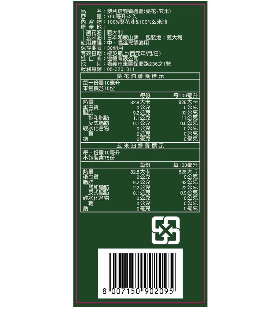 【限量】奧利塔雙饗禮盒(葵花+玄米)(無提袋)