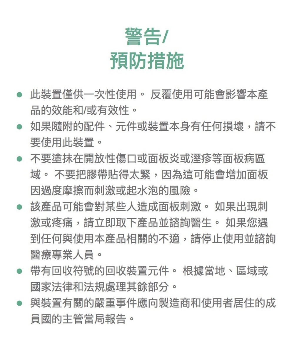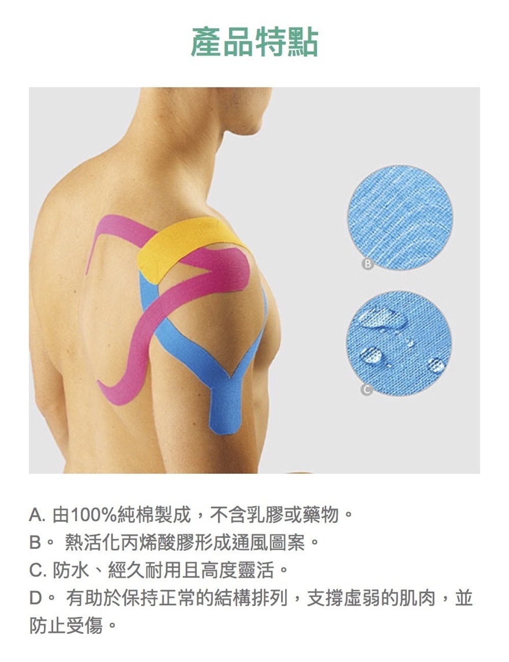 ◆ 注意事項1.請遵照醫師、防護員或專業人員指導使用。2.使用前請先清潔皮膚,不適用毛髮長與外傷者,以避免感染。3.太過乾燥的皮膚會增加過敏或不適感的發生,而潮濕的皮膚則會使黏著力降低。4.避免延伸貼布超過原來長度的140%,可能會因此降低其功能與增加過敏的機率。5.當使用在較為敏感的部位時(例如:腹部、腿部、手部內側或小孩及年長者的皮膚)應避免拉扯貼布。6.黏膠遇熱會增加黏性,在熱敷或接觸熱水後,須注意因黏度增加而可能產生的過敏現象。7.為確保貼布效用請定時更換,如產生過敏或搔癢不適,請立即停止使用;未使用完的貼布,請收捲好後置於盒中及陰涼處存放。8.不要直接使用在流血傷口處及已擦拭、塗抹任何有藥性或無藥性之皮膚上。9.特殊病症、請遵醫囑。使用後如有不適,請即停止使用並就醫治療。1、商品組合/規格:歐活醫療用黏性膠帶及黏性繃帶(未滅菌)2、醫療器材許可證◆核定品名:飛力軀幹裝具 (未滅菌) ◆核准字號:衛署醫器製壹字第005216號◆藥商名稱:歐柏醫療器材有限公司◆製造廠名稱:彪仕醫技股份有限公司◆製造廠地址:台南市南區中華路一段23號3、藥商許可執照◆醫材許可執照字號:中市醫材販 字第 MD6203022382 號◆藥商名稱:佑全藥品股份有限公司◆藥商地址:台中市西屯區福和里台灣大道四段925號20樓之1◆諮詢專線電話:0800-046-111 / 0800-557-6884、製造日期:詳見商品包裝標示及說明5、有效期間或保存期限:詳見商品包裝標示及說明6、消費者使用前應詳閱醫療器材說明書