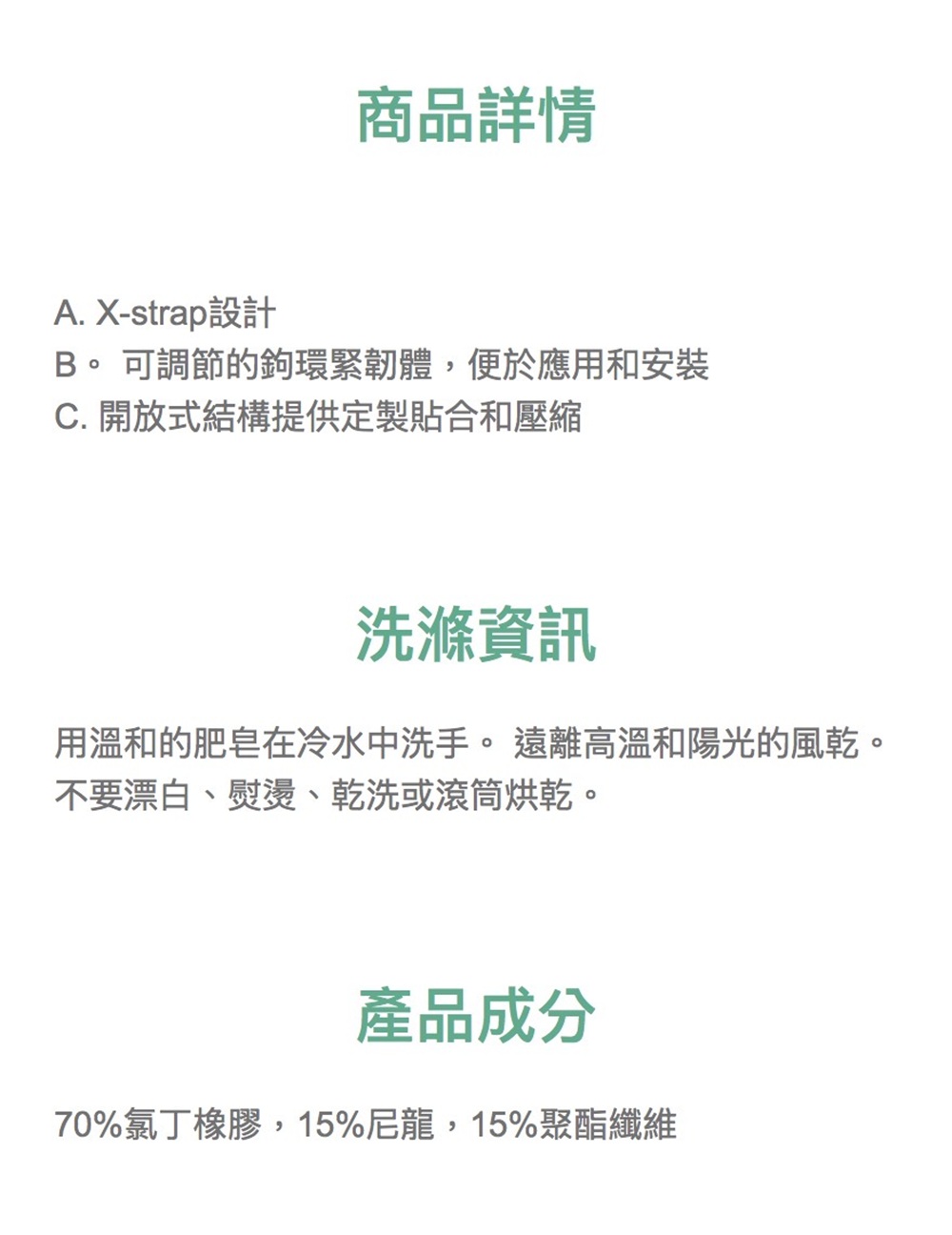 .高彈性交叉束帶:可強化踝部內、外踝的穩定度,降低活動中因疲勞或施力不當造成挫傷。.分段式加壓設計:可依症狀需求自由調整對腳背與足脛的束縛程度。.全開放式的設計:適合急性期踝部腫脹患者使用,穿脫極具方便性。量測踝骨上端的周長單一尺寸:19.1 – 25.4cm 7.5 – 10″加長型尺寸:25.4-31.8cm 10 – 12.5″1、商品組合/規格:OPPO.1103護踝(加大尺寸)2、醫療器材許可證◆核定品名: "歐活"肢體裝具(未滅菌)◆核准字號:衛部醫器製壹登字第001595號◆藥商名稱:歐柏股份有限公司◆製造廠名稱:彪仕醫技股份有限公司二廠◆製造廠地址:台南市南區中華西路一段43號3、藥商許可執照◆醫材許可執照字號:中市醫材販 字第 MD6203022382 號◆藥商名稱:佑全藥品股份有限公司◆藥商地址:台中市西屯區福和里台灣大道四段925號20樓之1◆諮詢專線電話:0800-046-111 / 0800-557-6884、製造日期:詳見商品包裝標示及說明5、有效期間或保存期限:詳見商品包裝標示及說明6、消費者使用前應詳閱醫療器材說明書 ◆ 注意事項1.產品彈性壓力及功能隨穿戴時間及頻率遞減,為確保產品效用達最大發揮,建議定期更換。2.穿戴後如有不適,請即停止使用並就醫診療。3.清潔用中性洗劑沖洗後風乾,請勿日照、熱烘。4.購買前請先檢查產品有無瑕疵;個人貼身用品,弄髒、毀損或洗滌過後,恕無法更換。 消費者使用前應詳閱醫療器材說明書
