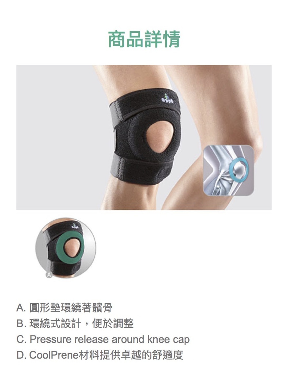 .單片纏繞式設計提供可調式的合身性.開放式髕骨設計,可舒解髕骨壓力.獨特的強化髕骨固定帶,可防止膝蓋移位,保溫功能和束護支撐量測踝骨上端的周長單一尺寸:31.8 – 40.6 cm加長型尺寸:40.6 – 50.8 cm1、商品組合/規格:OPPO.1125(可調)膝護套(黑)/個2、醫療器材許可證◆核定品名: "歐活"肢體裝具(未滅菌)◆核准字號:衛部醫器製壹登字第003506號◆藥商名稱:歐柏股份有限公司◆製造廠名稱:彪仕醫技股份有限公司二廠◆製造廠地址:台南市南區中華西路一段43號3、藥商許可執照◆醫材許可執照字號:中市醫材販 字第 MD6203022382 號◆藥商名稱:佑全藥品股份有限公司◆藥商地址:台中市西屯區福和里台灣大道四段925號20樓之1◆諮詢專線電話:0800-046-111 / 0800-557-6884、製造日期:詳見商品包裝標示及說明5、有效期間或保存期限:詳見商品包裝標示及說明6、消費者使用前應詳閱醫療器材說明書 ◆ 注意事項1.產品彈性壓力及功能隨穿戴時間及頻率遞減,為確保產品效用達最大發揮,建議定期更換。2.穿戴後如有不適,請即停止使用並就醫診療。3.清潔用中性洗劑沖洗後風乾,請勿日照、熱烘。4.購買前請先檢查產品有無瑕疵;個人貼身用品,弄髒、毀損或洗滌過後,恕無法更換。 消費者使用前應詳閱醫療器材說明書