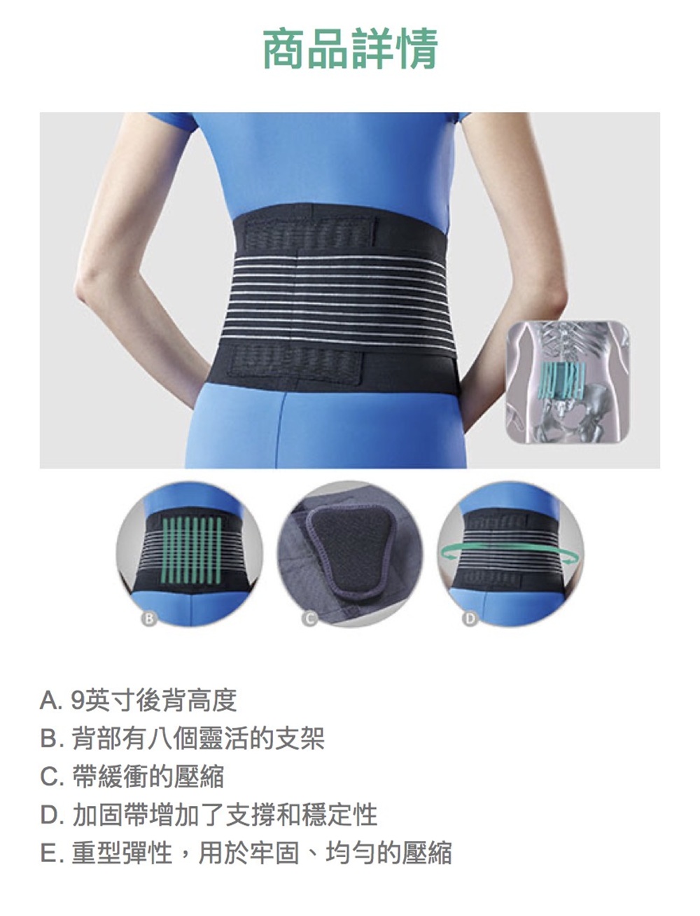 .可減輕腰部的不適,並提供穩固及舒適的支撐,有效舒解下背不適。.產品背後有8條彈性的支撐片,提供腰部理想的支撐。.雙層設計可強化腰部的穩定性。.可移動的T型墊片符合人體工學,可適時提供腰部支撐力,並對需要固定的腰椎進行加壓。.減輕腰部不適,並減少腰部肌肉所承受之應力。.有效緩解久坐及工作造成的不適感。量測腰圍S/M 61– 86.4cm 24– 34″L/XL 86.4– 111.8cm 34– 44″1、商品組合/規格:OPPO.L/XL-2167腰背支撐帶2、醫療器材許可證◆核定品名: “歐活”軀幹裝具 (未滅菌)◆核准字號:衛部醫器製壹登字第001596號◆藥商名稱:歐柏股份有限公司◆製造廠名稱:彪仕醫技股份有限公司二廠◆製造廠地址:台南市南區中華西路一段43號3、藥商許可執照◆醫材許可執照字號:中市醫材販 字第 MD6203022382 號◆藥商名稱:佑全藥品股份有限公司◆藥商地址:台中市西屯區福和里台灣大道四段925號20樓之1◆諮詢專線電話:0800-046-111 / 0800-557-6884、製造日期:詳見商品包裝標示及說明5、有效期間或保存期限:詳見商品包裝標示及說明6、消費者使用前應詳閱醫療器材說明書 ◆ 注意事項1.產品彈性壓力及功能隨穿戴時間及頻率遞減,為確保產品效用達最大發揮,建議定期更換。2.穿戴後如有不適,請即停止使用並就醫診療。3.清潔用中性洗劑沖洗後風乾,請勿日照、熱烘。4.購買前請先檢查產品有無瑕疵;個人貼身用品,弄髒、毀損或洗滌過後,恕無法更換。 消費者使用前應詳閱醫療器材說明書