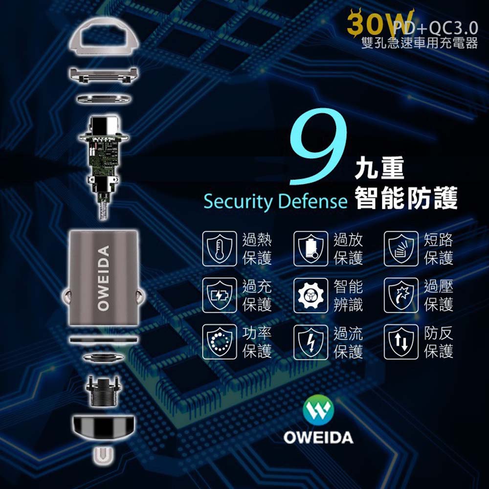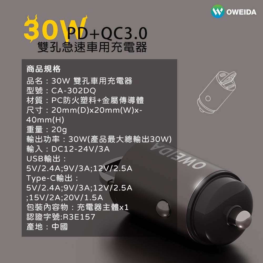 ※若二孔同時使用會降為DC5V/3A【商品規格】品名 : 30W 雙孔車用充電器型號 : CA-302DQ材質 : PC防火塑料+金屬傳導體尺寸 : 20mm(D)x20mm(W)x40mm(H)重量 : 20g輸出功率 : 30W(產品最大總輸出30W)輸入 : DC12-24V/3AUSB輸出 : 5V/2.4A;9V/3A;12V/2.5AType-C輸出 : 5V/2.4A;9V/3A;12V/2.5A;15V/2A;20V/1.5A包裝內容物 : 充電器主體x1