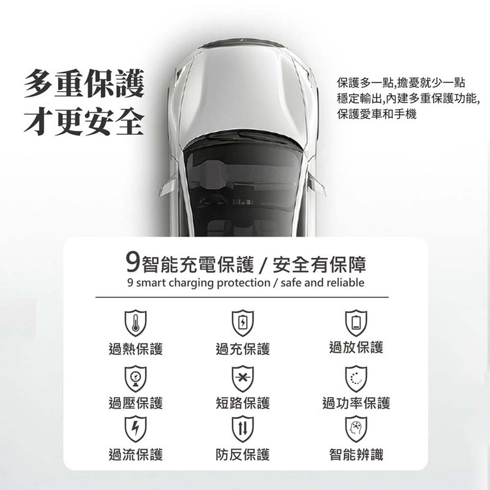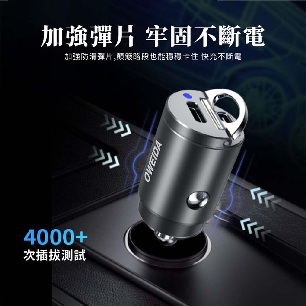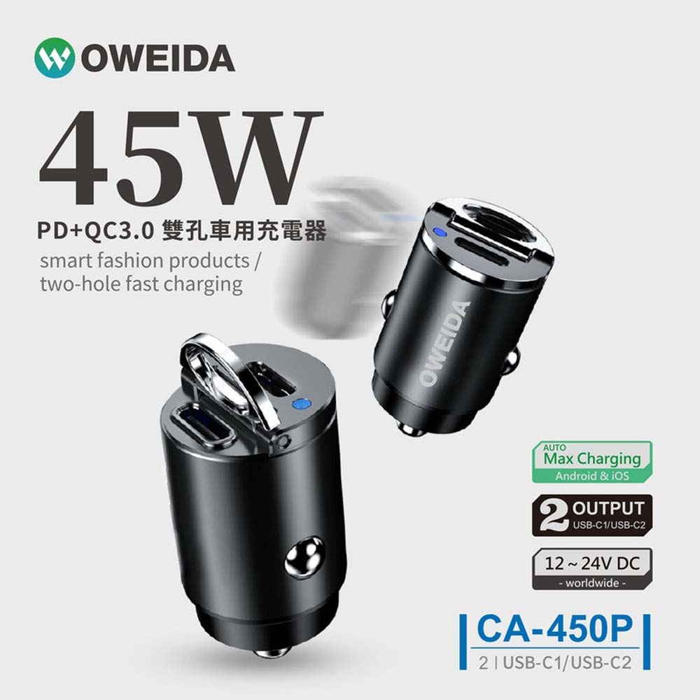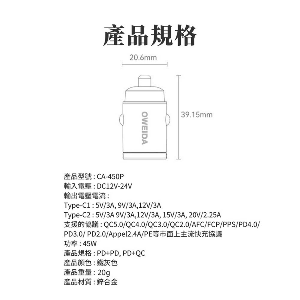 【產品特色】・PD+QC3.0極速快充 30分鐘充滿50%・迷你隱形 不佔車內空間・簡易拉環 插拔更方便・9種智能充電保護 安全有保障【商品規格】型號 : CA-450P輸入電壓 : DC12-24V/3.1A輸出電壓/電流 :Type-C1 : 5V/3A ; 9V/3A ; 12V/3AType-C2 : 5V/3A ; 9V/3A ; 12V/3A ; 15V/3A ; 20V/2.25A最大輸出功率 : 45W材質 : PC防火塑料+鋅合金尺寸 : 寬20.6mm*高39.15mm重量 : 20g