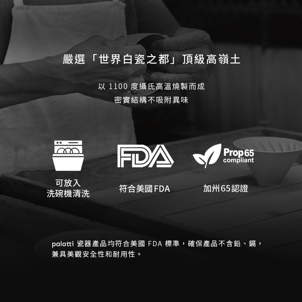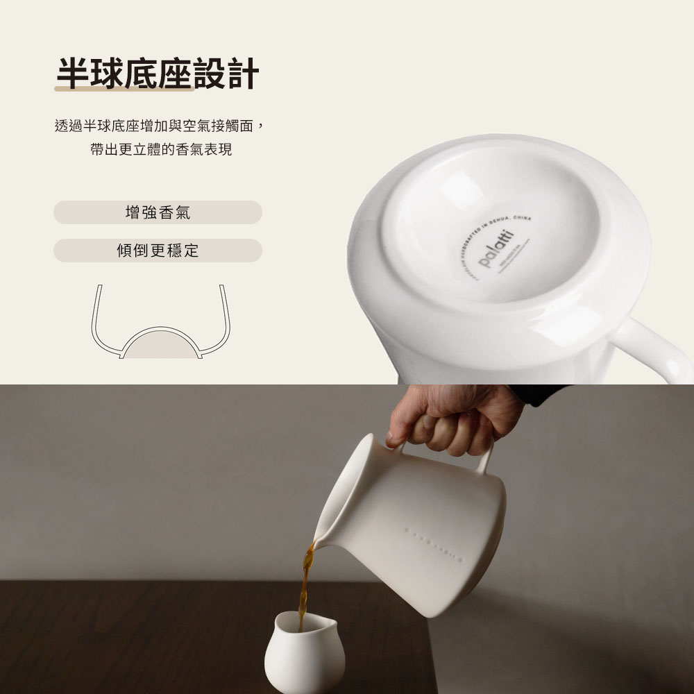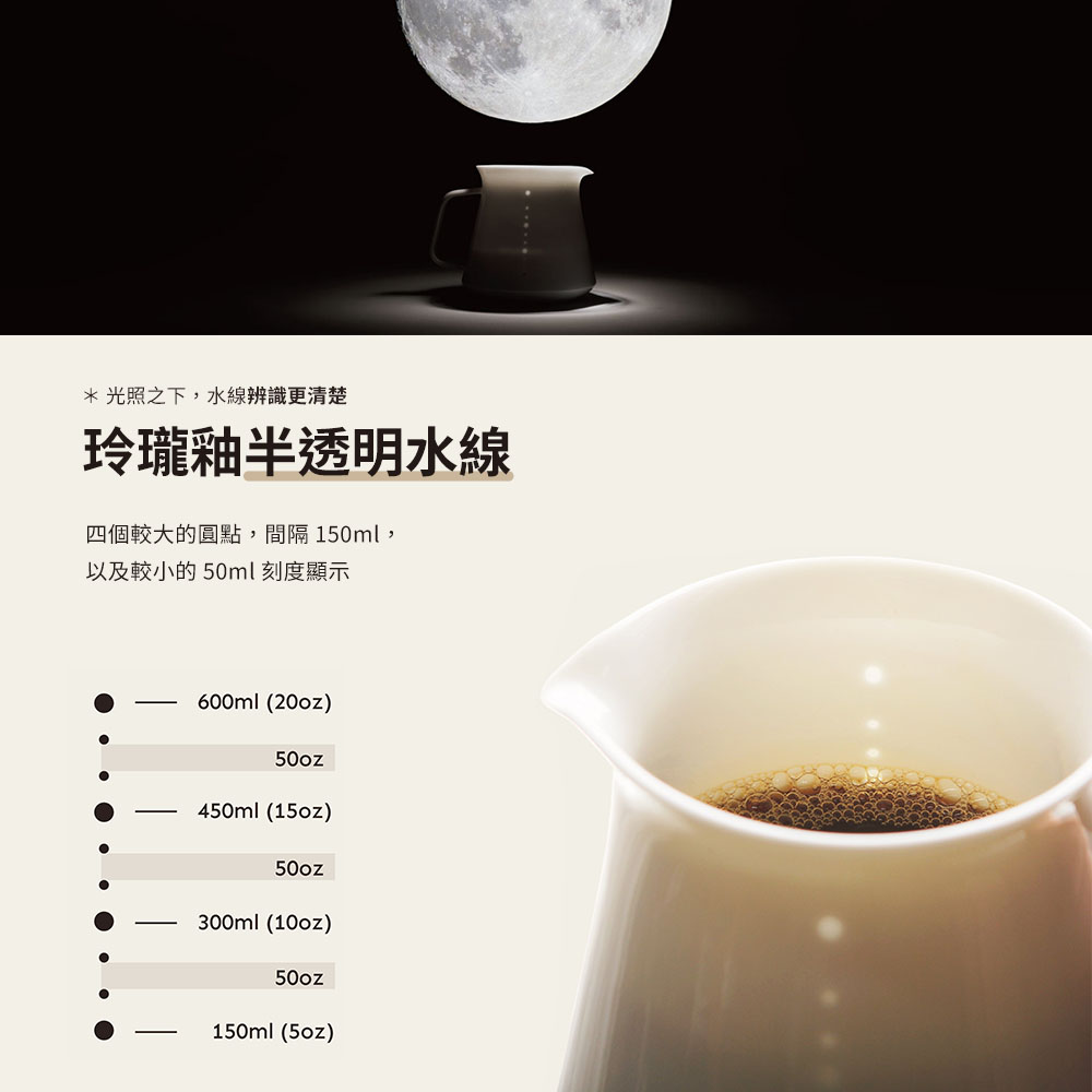 【palatti】Lunar咖啡分享壺,半透明水線刻度以玲瓏釉技術增添功能性及美感,包括四個較大的圓點,間隔為150ml以及較小的50ml增量。半球底座增加咖啡與空氣之間的接觸,擴大香氣釋放並增強每種沖泡的完整風味,這種結構還有助於保持穩定和控制的傾倒。Lunar咖啡分享壺是一個具有卓越藝術性的陶瓷分享壺,由中國德化手工級高嶺土製成,所有palatti瓷器產品均符合 FDA 和加州提案65標準,確保它們不含鉛,不含鎘,兼具美觀、安全性和耐用性。