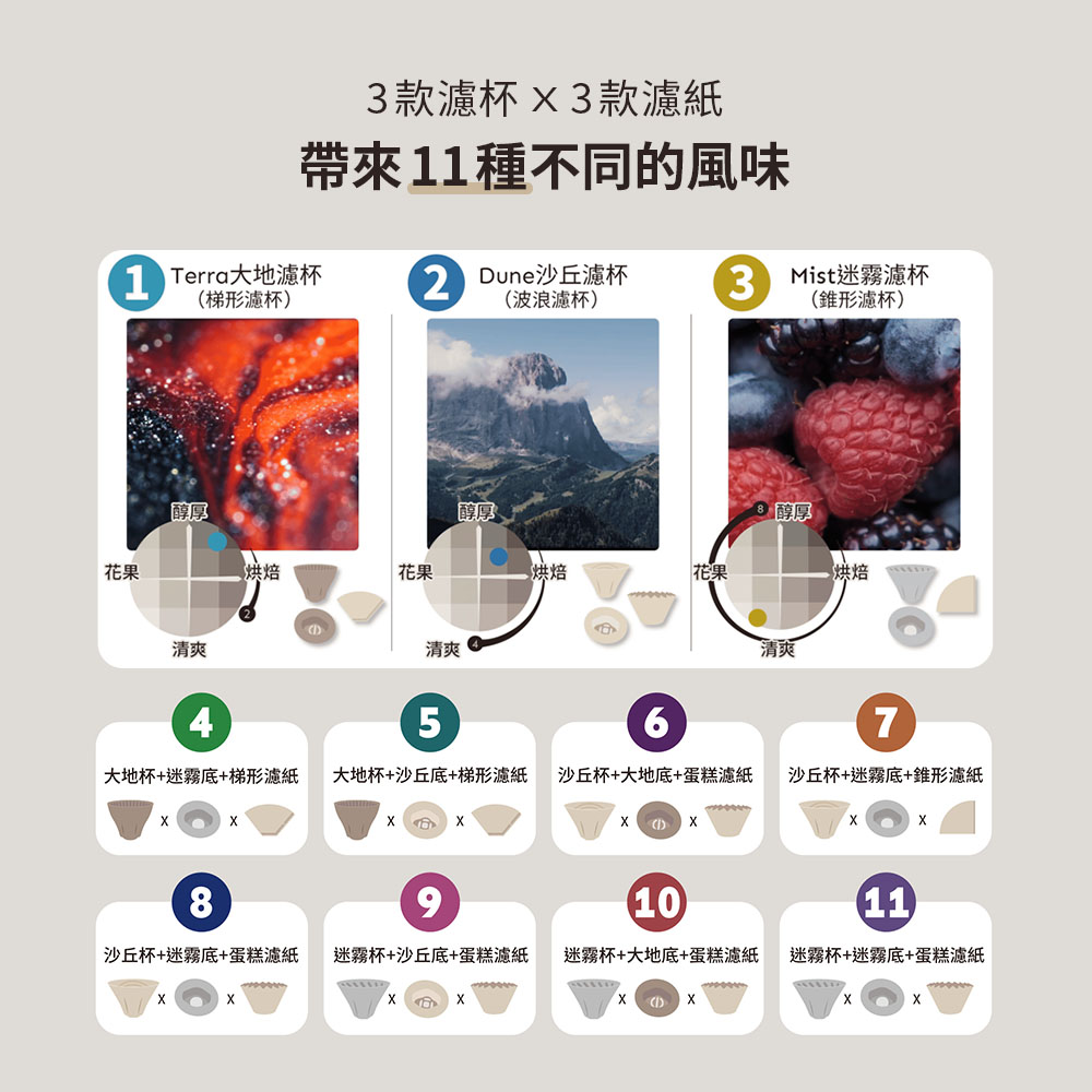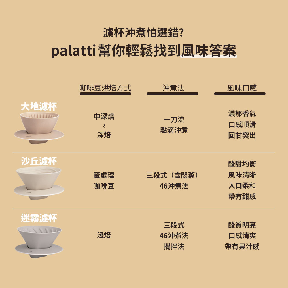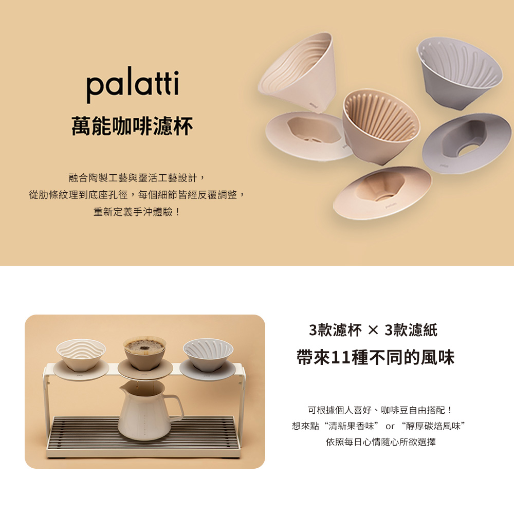 【palatti】Terra大地濾杯,採用德化瓷製成,在 1300°C 的高溫下燒製,不含鉛、不含鎘,可用洗碗機清洗,並符美國FDA 和 加州65提案的標準。垂直延展的肋骨結構,如大地脈絡般穩定搭配一字形排水濾杯,及特殊三孔底座設計,使咖啡粉層充分浸潤,以較慢的流速帶來濃郁的風味。3孔梯形設計確保咖啡床更高、流速中慢、萃取均勻,從而獲得醇厚美味的咖啡,palatti咖啡濾杯為專利模組化設計,可互換其他款palatti濾杯及底座,進行多種不同沖煮變化。