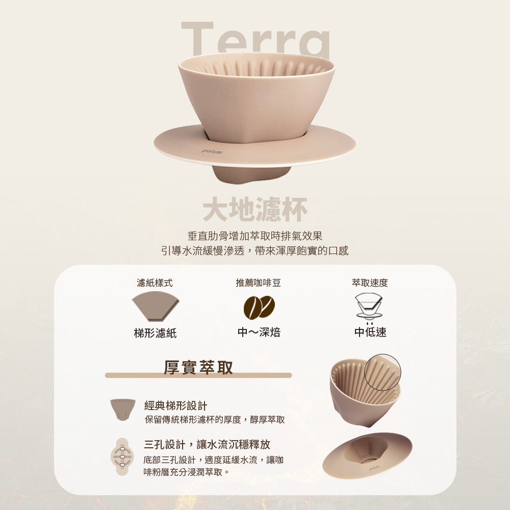 【palatti】全陶瓷萬能咖啡濾杯,採用德化瓷製成,在 1300°C的高溫下燒製,不含鉛、不含鎘,密實結構不吸附異味,沖煮出的咖啡風味乾淨,可用洗碗機清洗,並符美國FDA 和 加州65提案的標準。