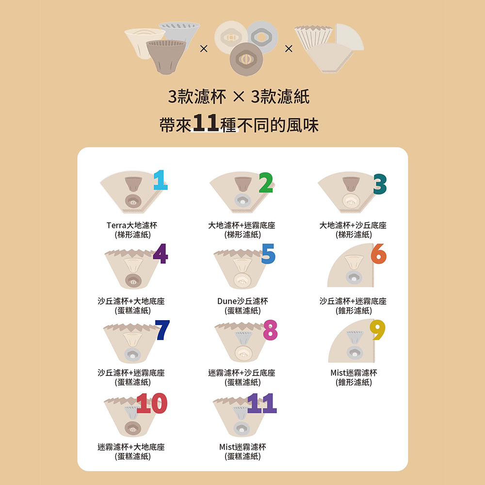 palatti咖啡濾杯為專利模組化設計,可互換其他款palatti濾杯及底座,進行多種不同沖煮變化,可與所有主流濾紙搭配使用。