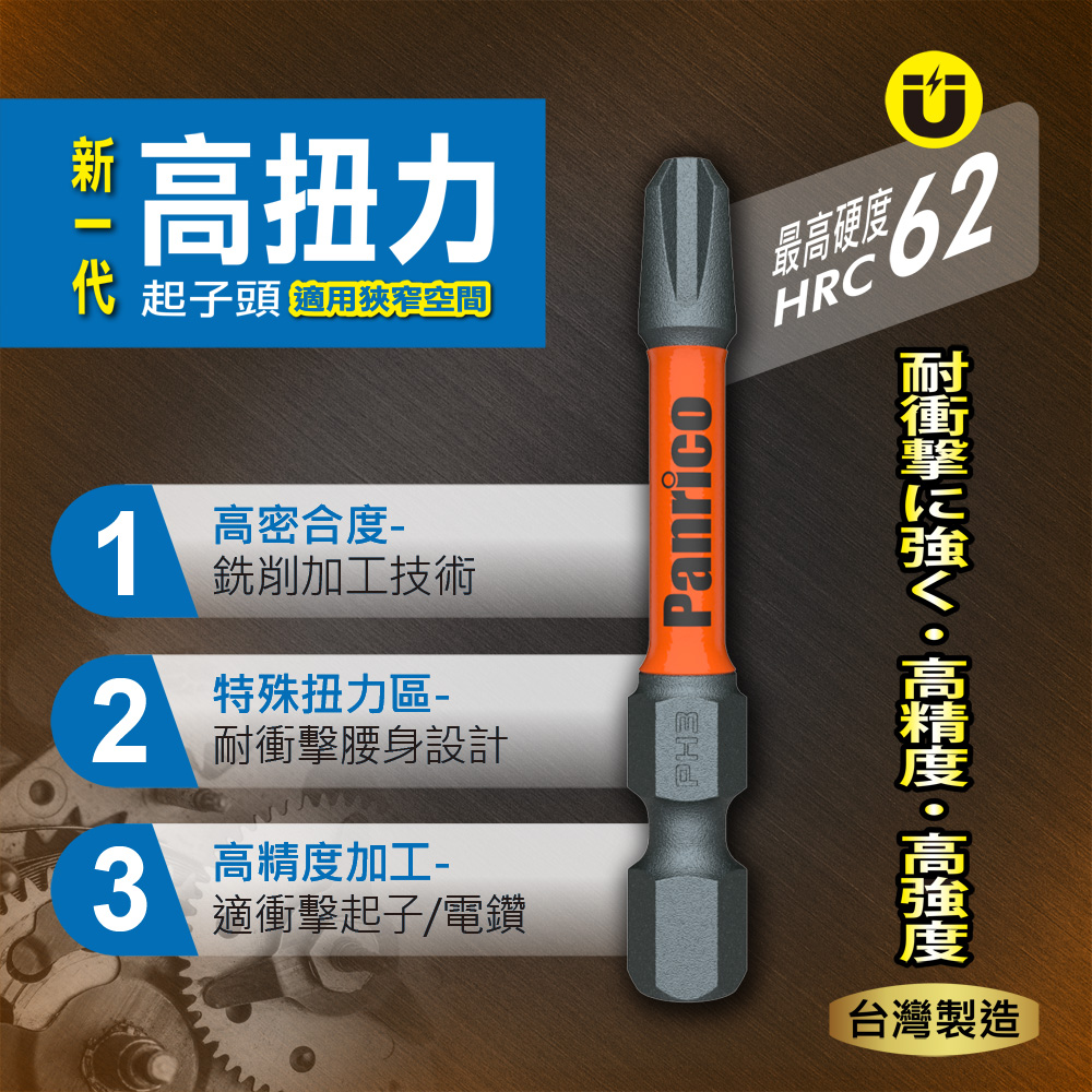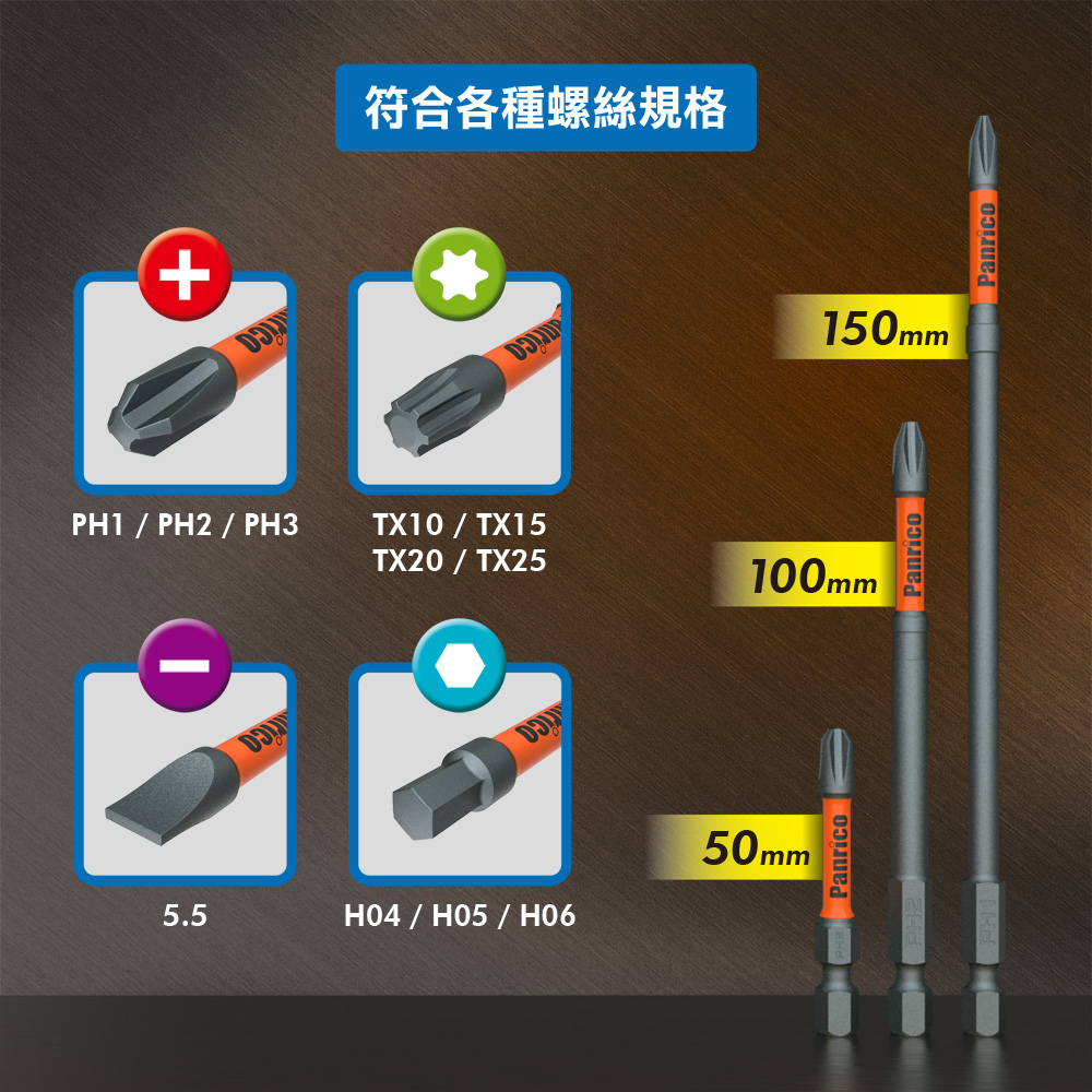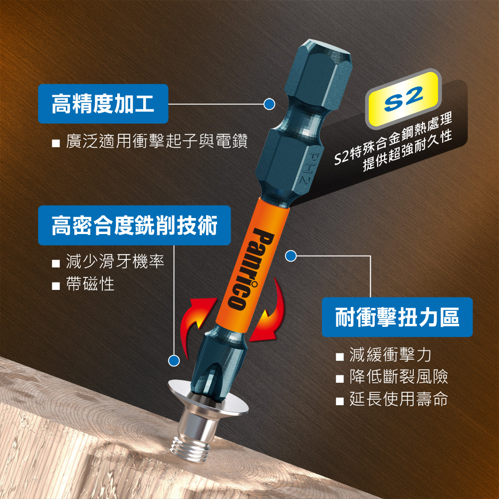 耐衝擊,使用壽命長 圓軸設計,便於狹窄空間使用 專為衝擊起子機所設計之高強度高扭力起子頭 適用於重載工作,諸如工廠或重工業工作