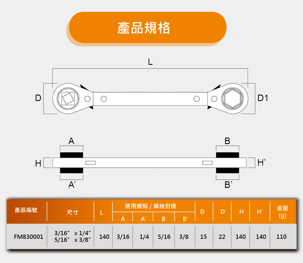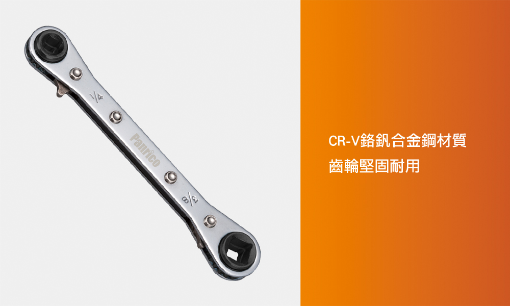 產品介紹 產品特色: 台灣製造棘輪平板四用扳手(齒輪扳手,套筒扳手,平板扳手) 適用於任何狹窄空間(特別是一般扳手無法使用時) 鉻釩鋼材質設計,齒輪堅固耐用 手柄鋼板採加厚設計,扭力更高 邊沿加套,握感舒適 特殊四角套筒適合冷氣、冷凍壓縮機進氣口閥,狹窄處使用 壓縮機進氣閥專用