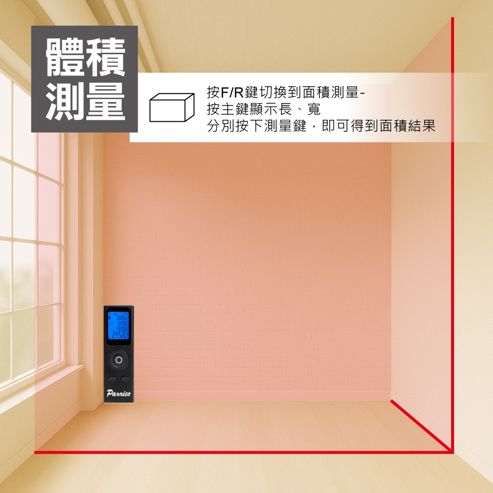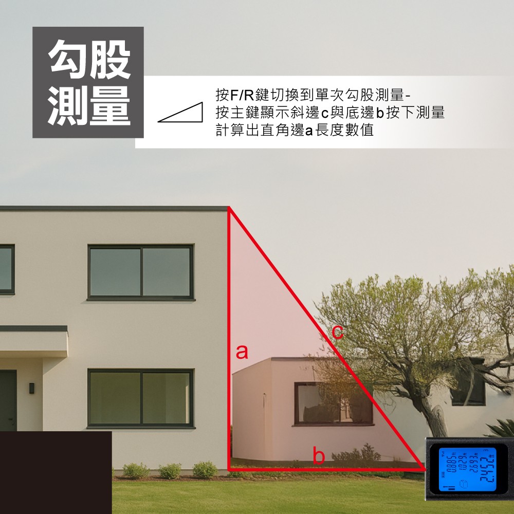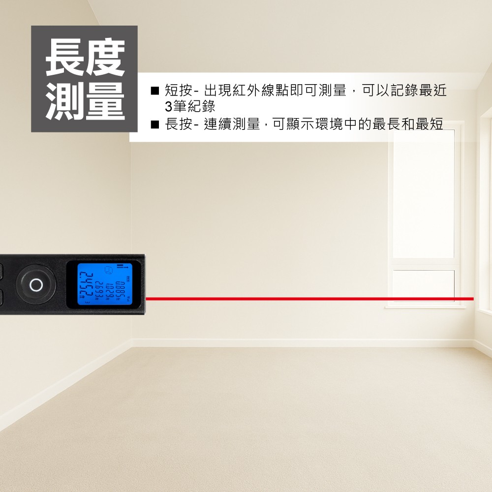 雷射測距儀可測量長度、面積、體積、勾股量測、勾股(相加)、勾股(相減)