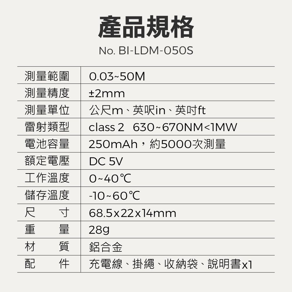 【Panrico 百利世】50M迷你雷射測距儀 鋁合金紅外線電子尺測距儀 (BI-LDM-050S)