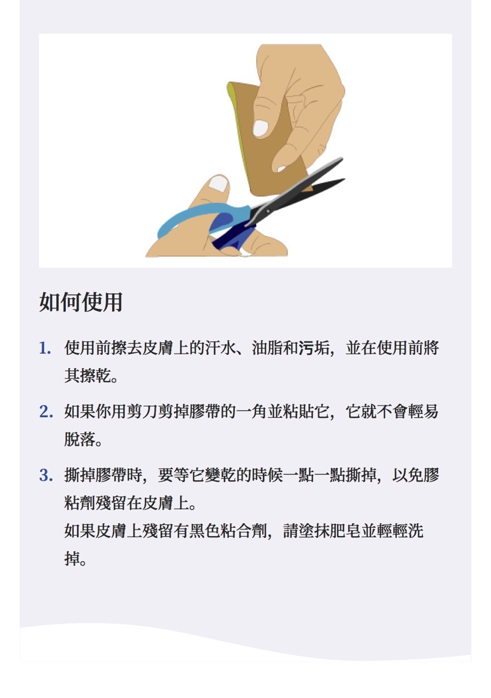 只需剪下並貼在您關心的部位減輕疲勞・預防寒冷!只需剪下並貼在您關心的部位。【推薦給這樣的人】●關心手指或手腕的人●感到僵硬或緊繃的人●關心腰部的人●關心膝蓋彎曲伸展的人●感到腿部沉重的人●運動時的護理●經常使用貼藥的人●身體某部分感到寒冷的人使用方法1. 請擦拭掉肌膚上的汗水和油脂。2. 將膠帶從盒子中拉出,然後根據需要貼的部位用剪刀剪下。3. 將膠帶從離型紙上撕下並貼上。● 使用後,撕下時可能會在肌膚上留下黑色的黏著劑。在這種情況下,請用濕毛巾輕輕擦拭或使用肥皂等清洗乾淨。※ 使用時,將角落剪掉可以減少過敏的發生。成分 ・ 原料棉、聚氨酯、黏合劑、石墨矽土注意事項・請根據以下的使用範例,正確地進行貼布。・不適合作為固定用膠帶。・黑色黏著部含有石墨矽土。1. 以下情況請勿使用:① 對黏著膠帶類有過敏或過敏症狀者② 骨折或韌帶損傷後不久③ 傷口④ 皮膚炎2. 使用中若出現皮疹、發紅、發癢等症狀,請立即停止使用並諮詢醫生。3. 請勿拉扯膠帶後再貼。4. 撕下膠帶時,請輕輕按住以避免拉起皮膚,並沿著毛髮的生長方向撕下。5. 為防止過敏:① 容易過敏的體質者,請先進行貼布測試後再使用。② 若感到癢,請立即撕下。③ 請勿連續貼在同一位置。④ 若不適合您的肌膚,請立即撕下。保管及使用相關注意事項1. 請保持產品在箱子內存放。2. 請存放在兒童無法觸及的地方。3. 請避免陽光直射及高溫,存放在乾燥涼爽的地方。■ 容量:50mm x 5m■ 原產國:日本