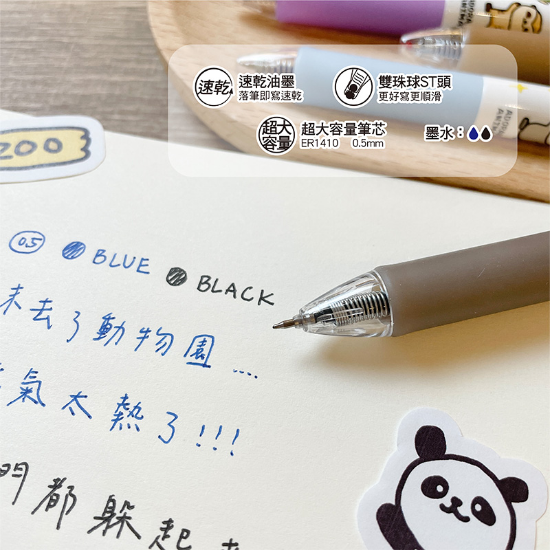 產品特色:.大容量筆芯,速乾油墨.ST筆頭書寫筆記舒服又滑順.可愛小動物,療癒身心靈