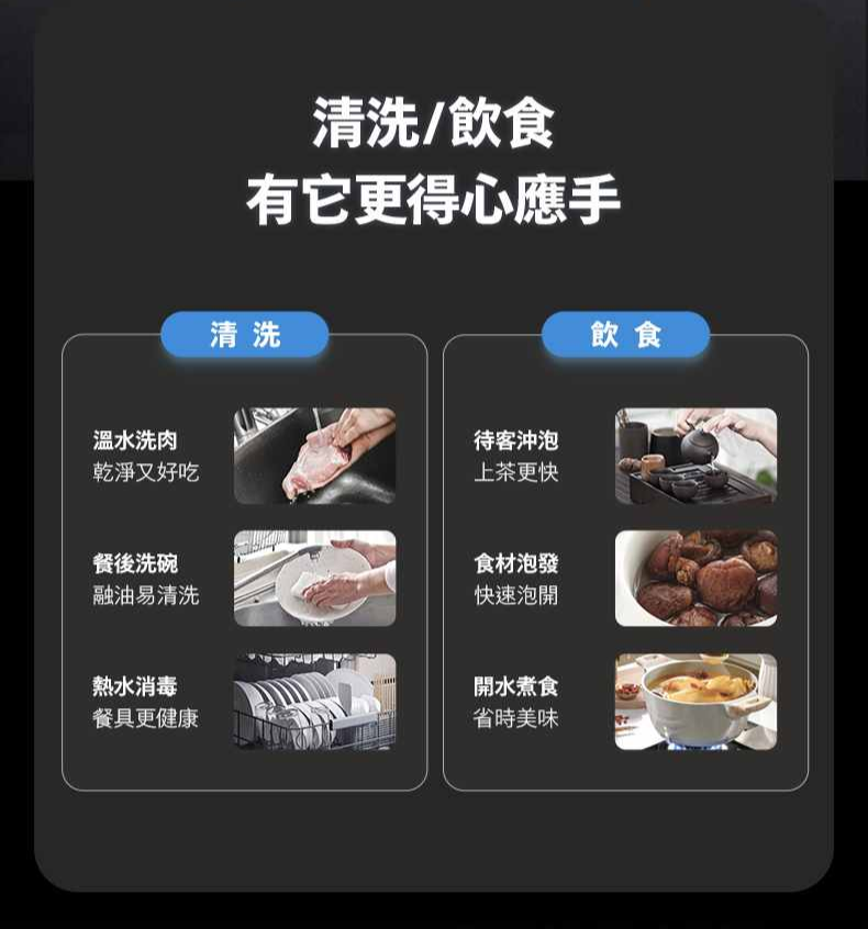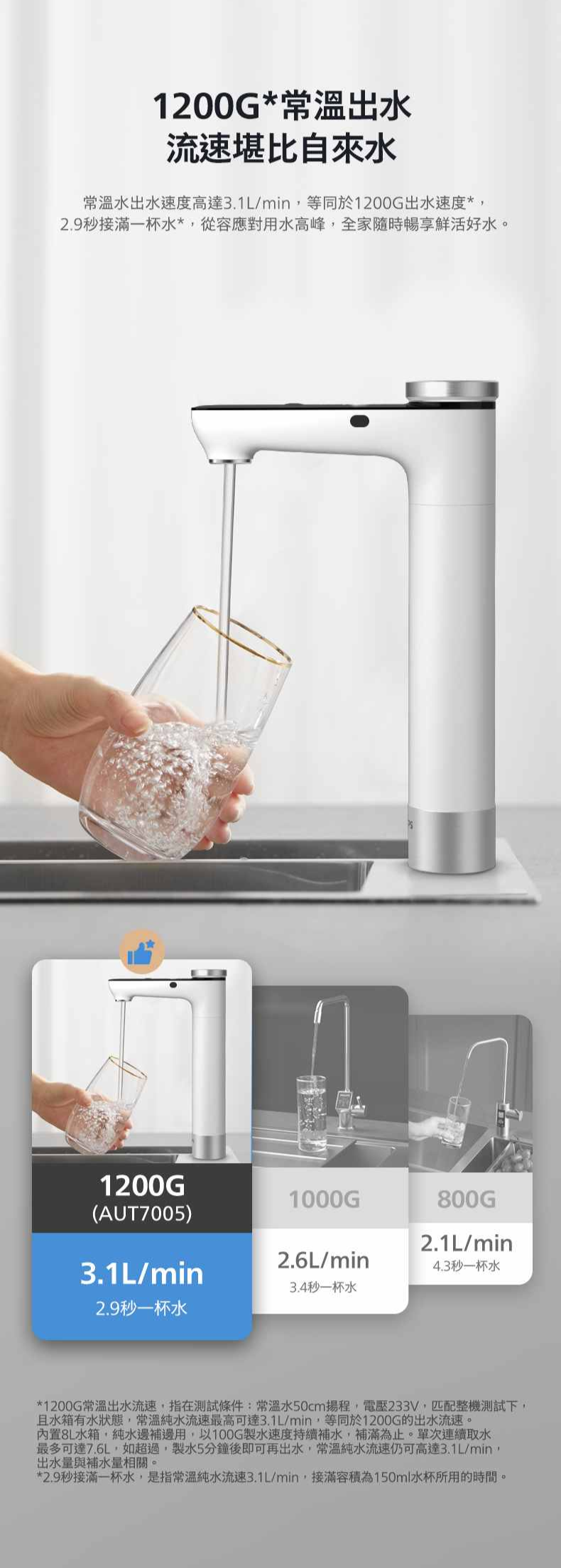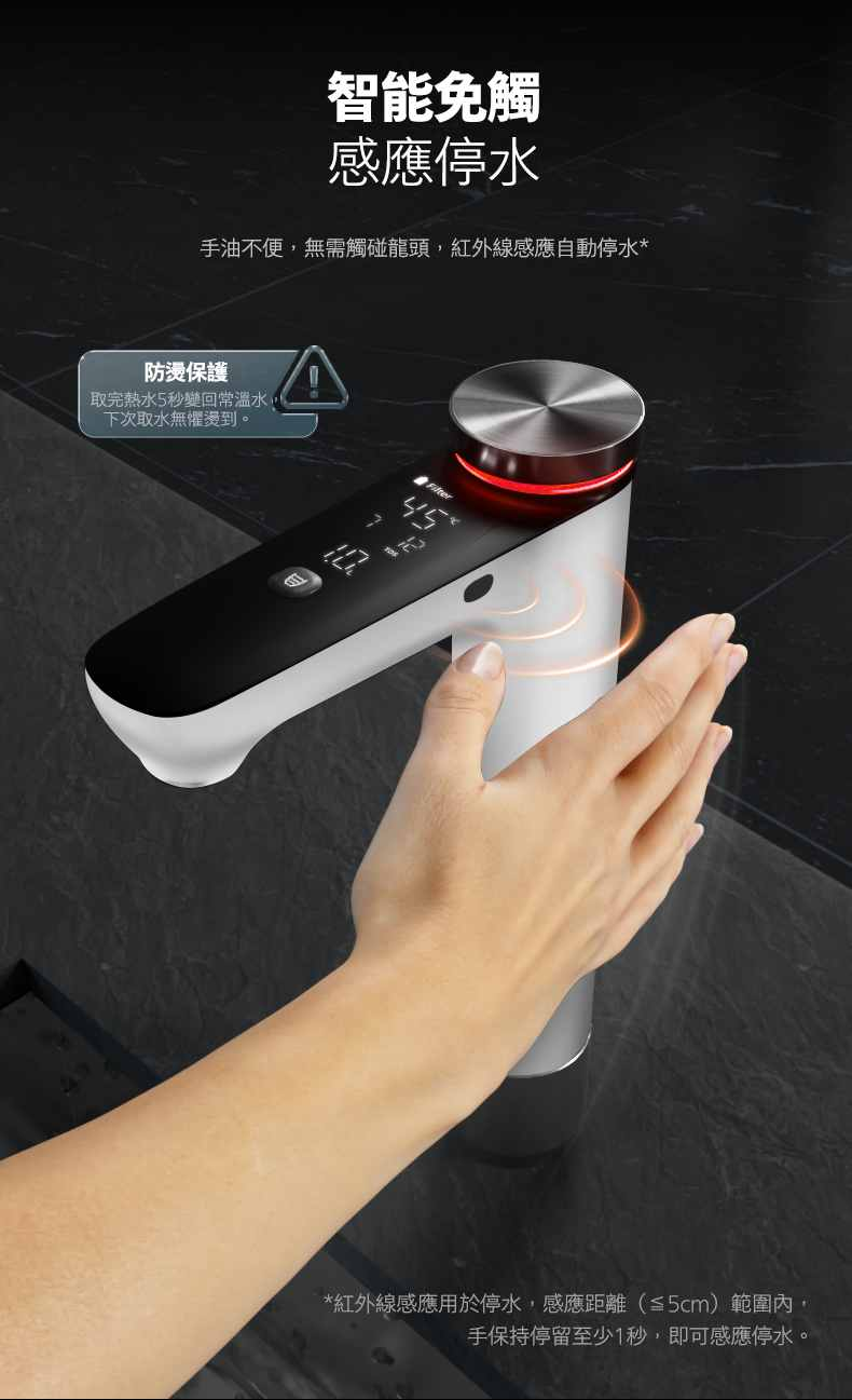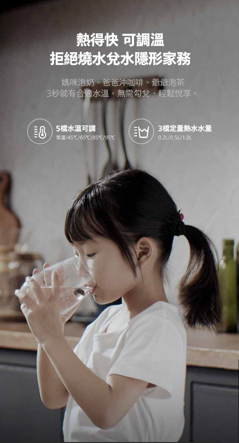 產品特色:- 3款濾芯,4重過濾系統- 有效過濾水中小至0.0001微米雜質及多達110種*有害物質- 多種水溫及暖熱水量選擇 即熱即飲- 5種水溫選擇: 常溫/45 ℃ /65 ℃ /85 ℃ /95℃- 4種暖熱水量選擇: 0.2升/0.5升/1.0升/1.5升- 連續出水量多達7.6公升- 智能顯示水溫、水質(TDS值)、水量及濾芯夀命- 非觸式停水感應- 水箱內置UV-C殺菌燈- 每分鐘3.1升水流速--------------------------------------------------------------------------------------------------------------------------產品規格 主要功能:RO過濾及即熱 過濾系統:Aquaporin RO淨化系統 濾芯:AQP RO 濾芯/ 複合濾芯 / 天然 椰殼活性碳濾芯 濾芯壽命: -AQP RO濾芯:長達3年(過濾水量:10,950公升)-AQP RO過濾器:長達3年(過濾器容量:10,950L)-複合濾芯:長達1年(過濾水量:3,650公升)-複合過濾器:最長1年(過濾器容量:3,650L)-天然椰殼活性碳濾芯 :長達1年(過濾水量:3,650公升)-天然椰殼活性碳過濾器:最長1年(過濾器容量:3,650L)濾芯放置:直向放置安裝:櫥下式(直向安裝) 專用獨立水龍頭:Philips智能顯示即熱水龍頭 過濾物料: 1. PP棉 2.活性碳3. 水通道蛋白RO膜4.後置活性碳出水水溫:常溫, 45 °C, 65 °C, 85 °C & 95°C溫熱水出水量: 0.2升(L)/0.5升(L)/1.0升(L)/1.5升(L)連續出水量:多達7.6公升功率:2150W 濾芯壽命指示燈:LED燈(機身及智能顯示即熱水龍頭)水路沖洗:自動及手動水路沖洗尺寸(闊x高x深):185*390*417 毫米(mm) ▲如超過最多出水量,須待製水5分鐘後即可再出水^如超過最大持續水流量,請等待5分鐘進行水過濾