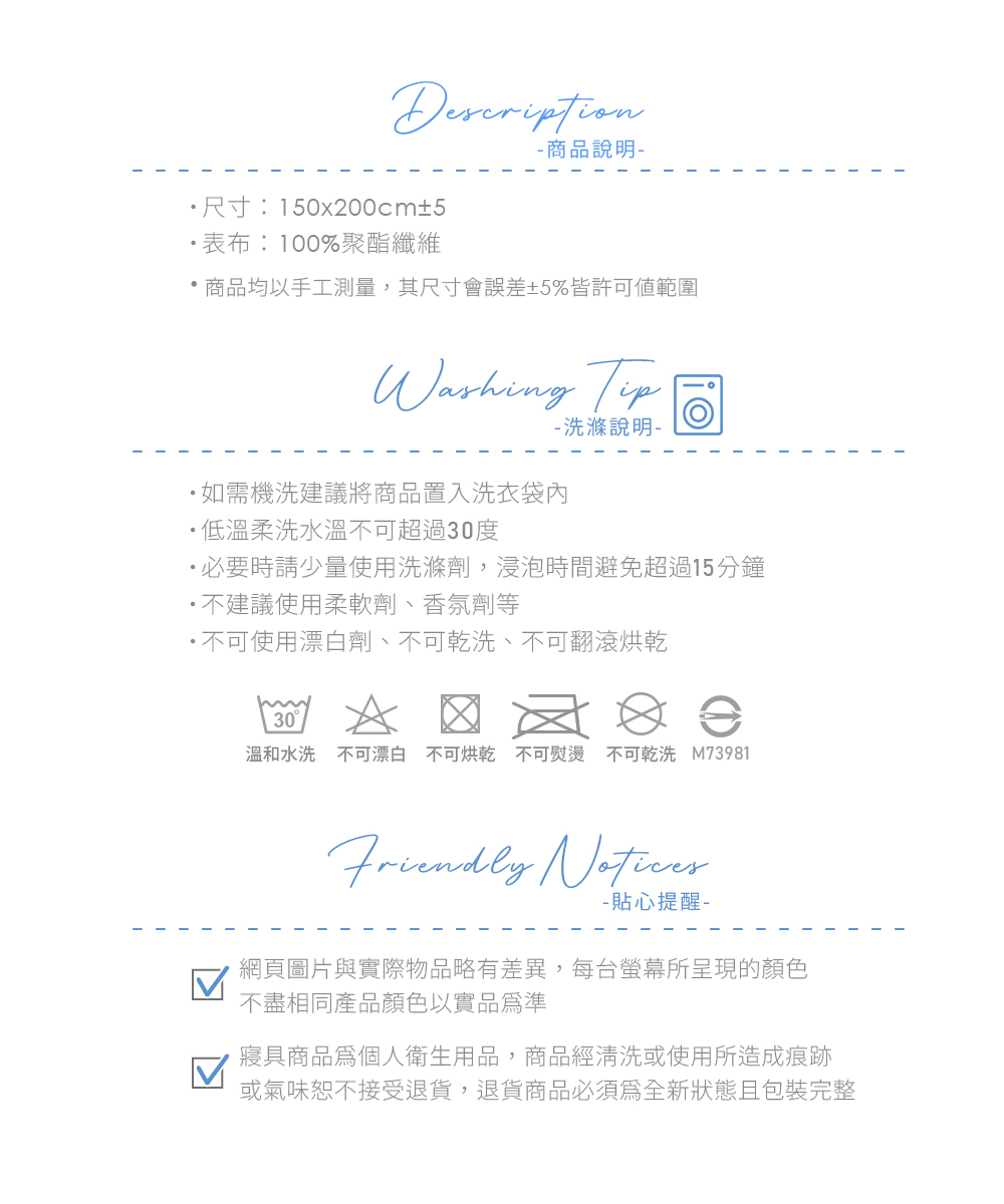 尺寸:150x200cm±5·表布:100%聚酯纖維·商品均以手工測量,其尺寸會誤差±5%皆許可值範圍·商檢局檢驗字號:M73981·清潔方式:可水洗(水溫不超過攝氏30度)/不可乾洗/不可烘乾/不可漂白/不可熨燙·請使用大型洗衣袋清洗,可保持色澤鮮明,更不易造成勾紗等現象※網頁圖片僅為示意圖參考,不含拍攝道具,實際出貨件數以「商品內容」說明為主※因拍攝關係或螢幕色差,網頁圖片與實品略有差異,產品圖僅供參考