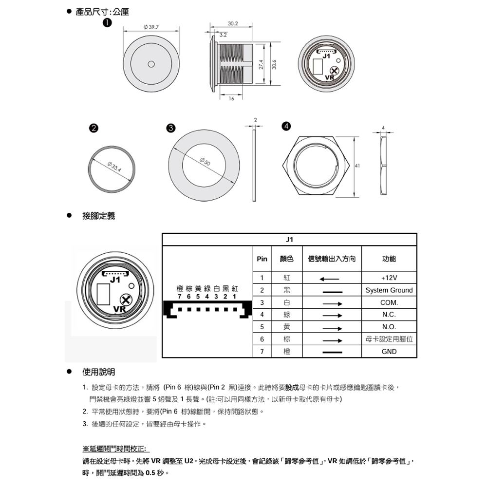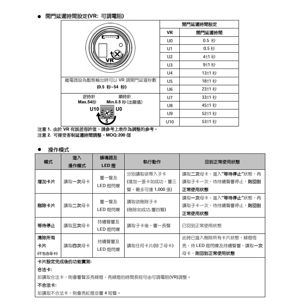 - 以可調電阻(VR)調整開門延遲時間(0.5~54秒)。