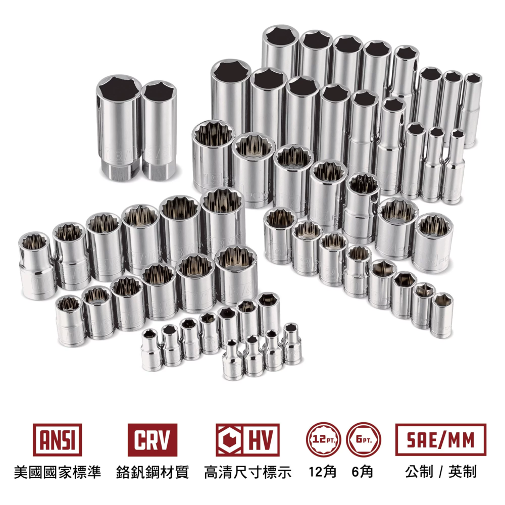 在找尋英制工具組嗎? Powerbuilt152件式公 / 英制汽修工具組提供市場最完整的套筒、板手、棘輪板手的組合,組套包含兩分、三分、四分完整的公制、英制工具。棘輪板手作為套筒工具裡的核心,Powerbuilt152件式工具組裡的兩分、三分、四分棘輪板手採用市場最高等級七二齒內部結構,可以在狹小空間內擁有5度的工作角度,外型採用美式鏡面拋光表面處理以及全封頭部設計,使棘輪板手容易維護,隨時保持最佳狀態。組套內的公 / 英制梅花開口板手採用最高等級鉻釩鋼鍛造製成,以及特殊的加長版規格,可以輕易到達內部狹小空間,並且提供更高的扭力。套筒為鉻釩鋼材質,非市場常見的碳鋼製成,提供更好的硬度、韌性、以及可承受更大扭力,大大提升了耐用度。每顆公制、英制套筒皆採用Powerbuilt專利HV ( High-Visibility Size Marking) 打字技術,將尺寸放大,並且清楚的標示於套筒,在選取或找尋工具時,提供極佳的便利性。除此以外,套筒組內包含了接桿、方桿、套筒轉接頭、萬向接頭、套筒起子、內六角板手、火星塞套筒、起子頭,提供了完整拆卸一台車所需的工具。