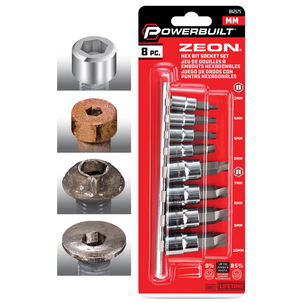 Powerbuilt寶力優工具 Zeon套筒起子組設計用於夾持和轉動損壞和滑牙的圓形六角螺絲。 Zeon套筒起子獲得全球專利的設計可牢牢抓緊並且轉動圓角螺絲。換句話說,當六角頭螺絲損壞太嚴重而無法使用普通的套筒起子或內六角板手轉動時, Zeon套筒起子會讓您速迅擺脫困境。Zeon套筒起子組同樣適用於全新或未損壞的緊固件與螺絲。Zeon套筒起子頭部使用最高等級S2材質製成並且與鉻钒鋼套筒壓配做完美結合,展現極高的強度和耐用性。