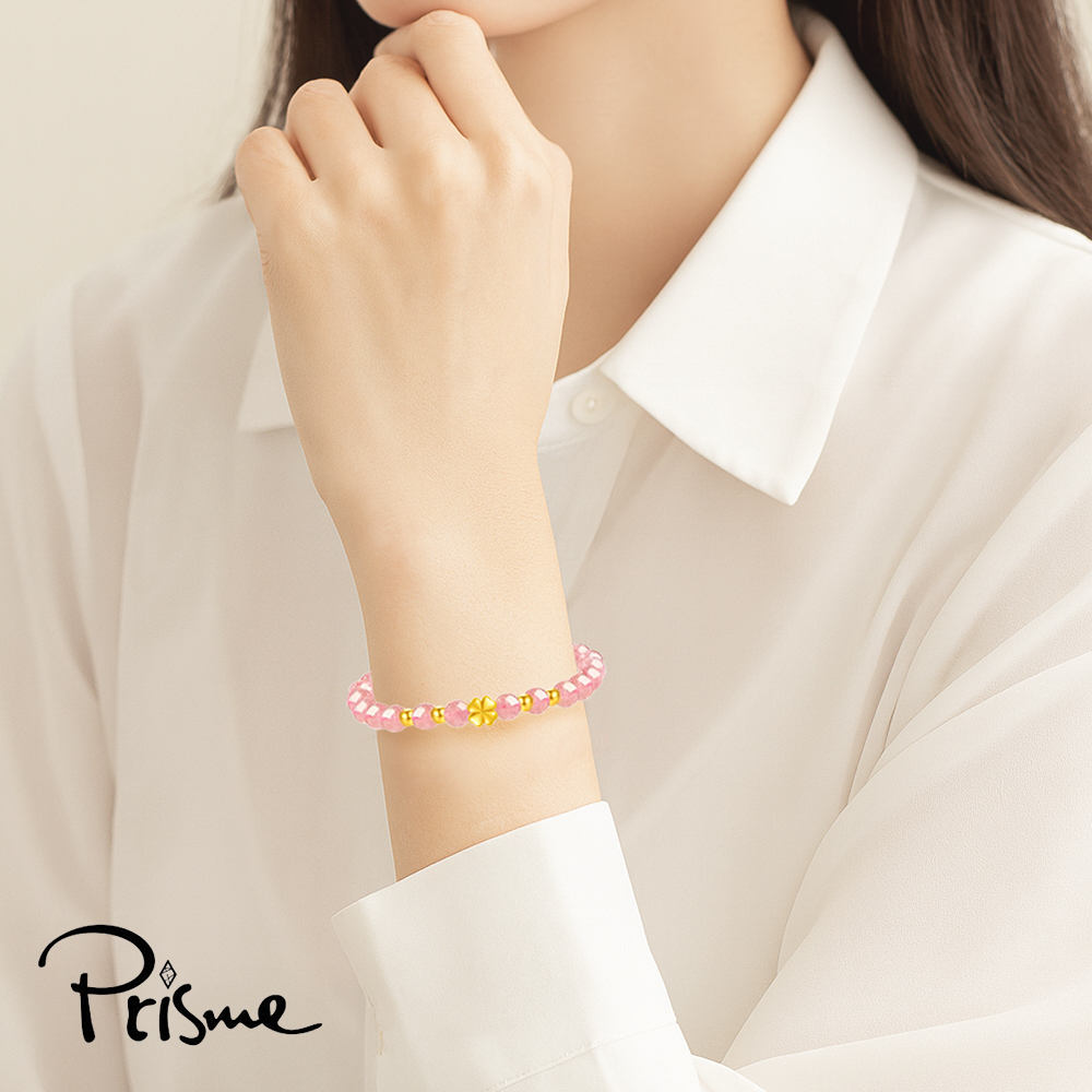 【Prisme Gold】黃金手鍊 999純金綴飾粉珠手鍊 (金重:約0.05錢±0.02) - 優雅四葉草