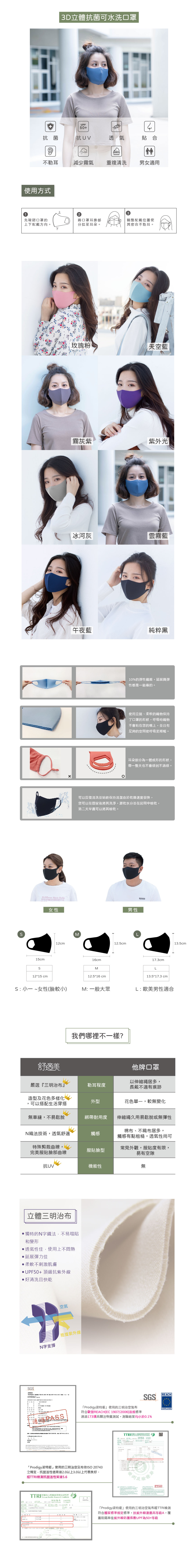 "不再只是一層保護 走上流行穿搭更加分"▲3D立體空氣布使其透氣,呼吸順暢不悶熱▲ 完全貼合臉部曲線,戴眼鏡時,減少霧氣▲一體成型無車縫,不使耳朵疼痛▲抗UV,抵擋紫外線侵害及抗菌認證【尺寸】L/17.3*13.5cm(±1cm)/14gM/16*12.5cm(±1cm)/9.5gS/15*12cm(±1cm)/7.5g(小臉/骨架小)Kid/13*10.5cm(±1cm)/4g(3-7歲)【材質】聚酯纖維90%、 彈性纖維10%【注意事項】1.產品顏色依實體為主。2.本產品不使用在有害粉塵或煤氣洩漏等場合。3.如果皮膚上有異常的情況,請立即停止使用。4.配戴過程中,如果有覺得噁心或氣味難以忍受,請立即停止使用。5.使用清水清洗即可,本產品可以快速風乾。6.摘下口罩時,請小心注意,避免指甲刮傷臉蛋,此外戴眼鏡的人,在摘下口罩時,也要小心避免口罩勾住眼鏡。