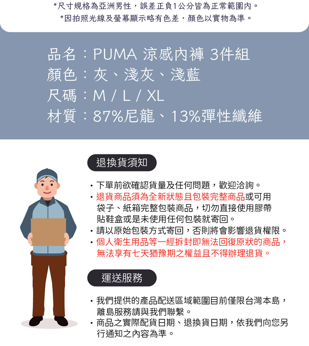 產品描述:PUMA 涼感內褲 3件組 701232510 灰/淺灰/淺藍特色:高密度冰絲材質,觸感絲滑冰涼。高回彈腰帶,舒適不勒不變形。雙層內襠、3D抗菌囊袋,貼身穿著更舒適。褲腳剪裁,舒適無痕裸邊。材質: 87%尼龍 ,13%彈性纖維尺碼: M / L / XL【注意事項】1.提供15天鑑賞期之權益2.退貨商品須為全新狀態且包裝完整商品,請以原始包裝方式寄回,包含完整無損之外箱、商品、包裝紙,目錄、吊牌、贈品、配件等,若原外箱已遺失,請另使用紙箱包覆於商品原廠包裝外,切勿直接於原包裝上黏貼紙張或書寫文字,來做寄送,若原盒內所有物品有損壞或遺失,須付整新費。3.個人衛生用品一經拆封即無法回復原狀的商品,無法享有7天猶豫期之權益且不得辦理退貨。