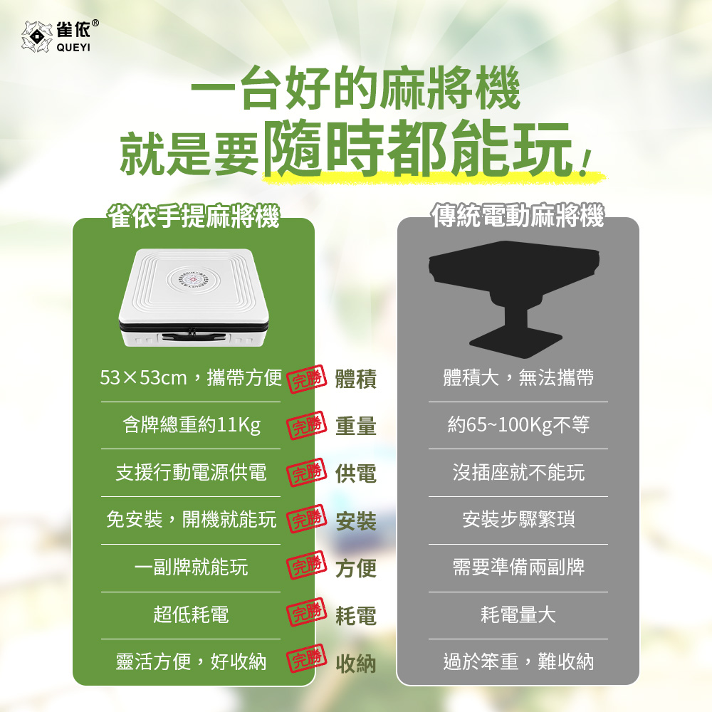 你是不是也愛跟三五好友圍桌打麻將,聽著牌聲嘩啦嘩啦響,享受喊著「碰!」「槓!」的那種爽感?但每次要搬麻將桌、整理牌,總覺得麻煩到想放棄?別擔心,QUEYI 雀依 Q301 手提麻將機來救場啦!這台輕巧又超實用的麻將機,絕對是你最值得入手的娛樂神器!產品特點● 麻將機本體重量僅約6.5Kg,含牌總重約11 Kg,體積小巧(約53×53×14cm),可輕鬆放入汽車後車廂或收進家中角落。想去阿里山露營打牌?還是到朋友家開戰?隨手一提就走,麻將派對想開就開!● 沒插座也能照樣玩!支援行動電源與插座供電,超低耗能,使用20000mAh的行動電源,約可暢玩10Hr。不論是海邊的露營對局,還是室內的深夜狂歡,讓您不受場地限制,實現麻將自由!● 全自動洗牌與發牌系統,秒速開局,有效防止作弊,告別手動洗牌的麻煩。幾秒內即可進入戰鬥狀態,專注享受每一場對戰的刺激!● 採用碳纖維材質,耐用易清潔,質感高雅。內部收納空間可容納麻將、牌尺與行動電源。● 貼心設計,購買即附144張麻將跟4隻牌尺、麻將收納袋、麻將機防塵套,所有配件一應俱全,方便又專業!● 專為熱愛麻將的您而設計,這不只是麻將機,還是你和朋友的回憶製造機~無論是週末聚會、露營旅行,還是戶外派對,都能輕鬆融入,讓歡樂升級。操作簡單易上手,讓您隨時隨地都能享受麻將帶來的樂趣,滿足牌癮。● 送禮的絕佳選擇,既實用新潮又時尚,送給親友保證面子十足。讓每一次相聚都充滿笑聲,變成最珍貴的時光!注意事項※搭配使用的行動電源需具備快充功能,且單口輸出大於12V/2.5A/30W以上,方能達到最佳供電效果。 ※本商品出貨不含行動電源,如有需要,歡迎至佳美能官網選購。※購買所附的麻將為36號磁吸麻將,背面共有藍色和綠色兩種款式,隨機出貨。