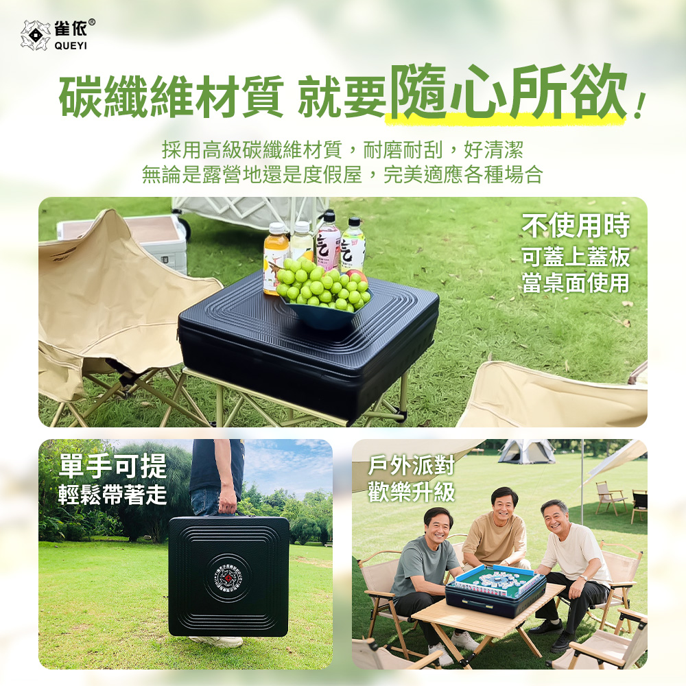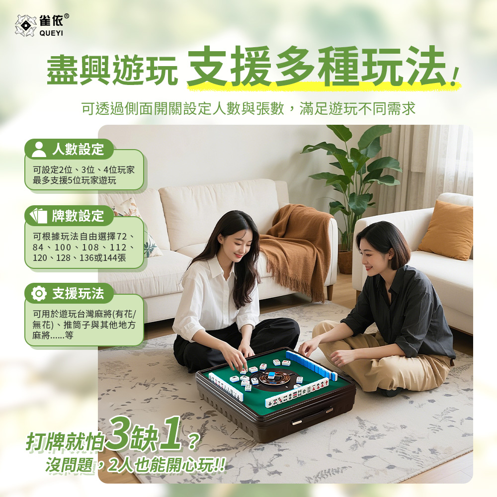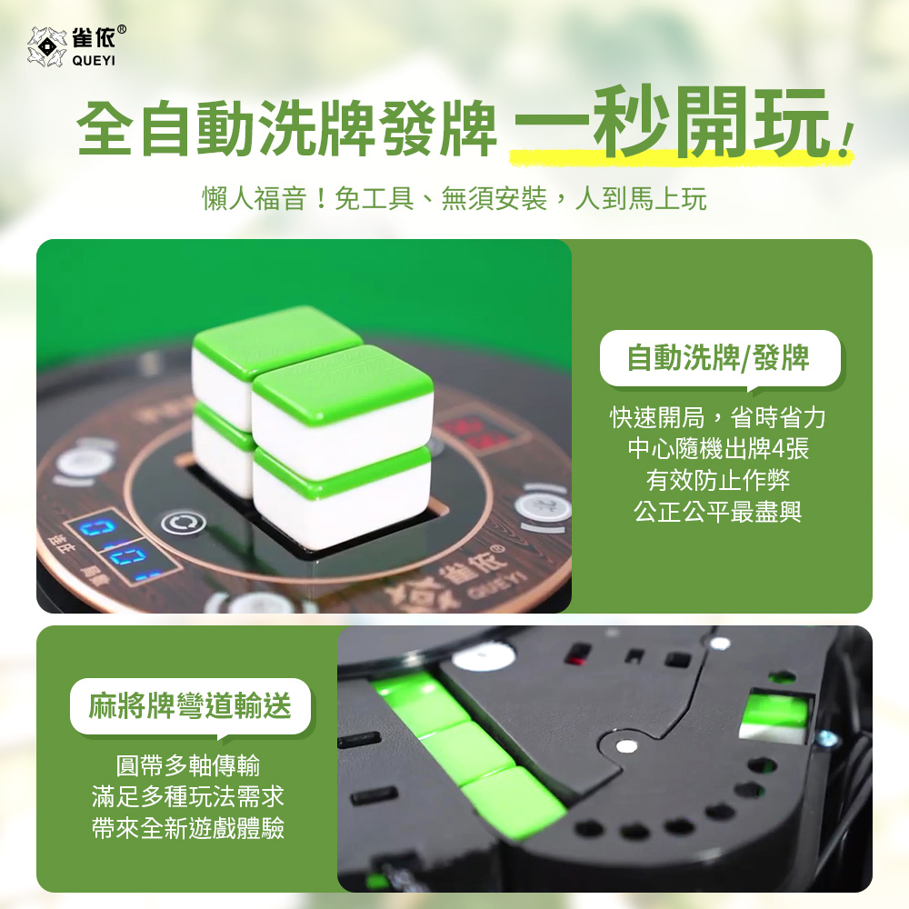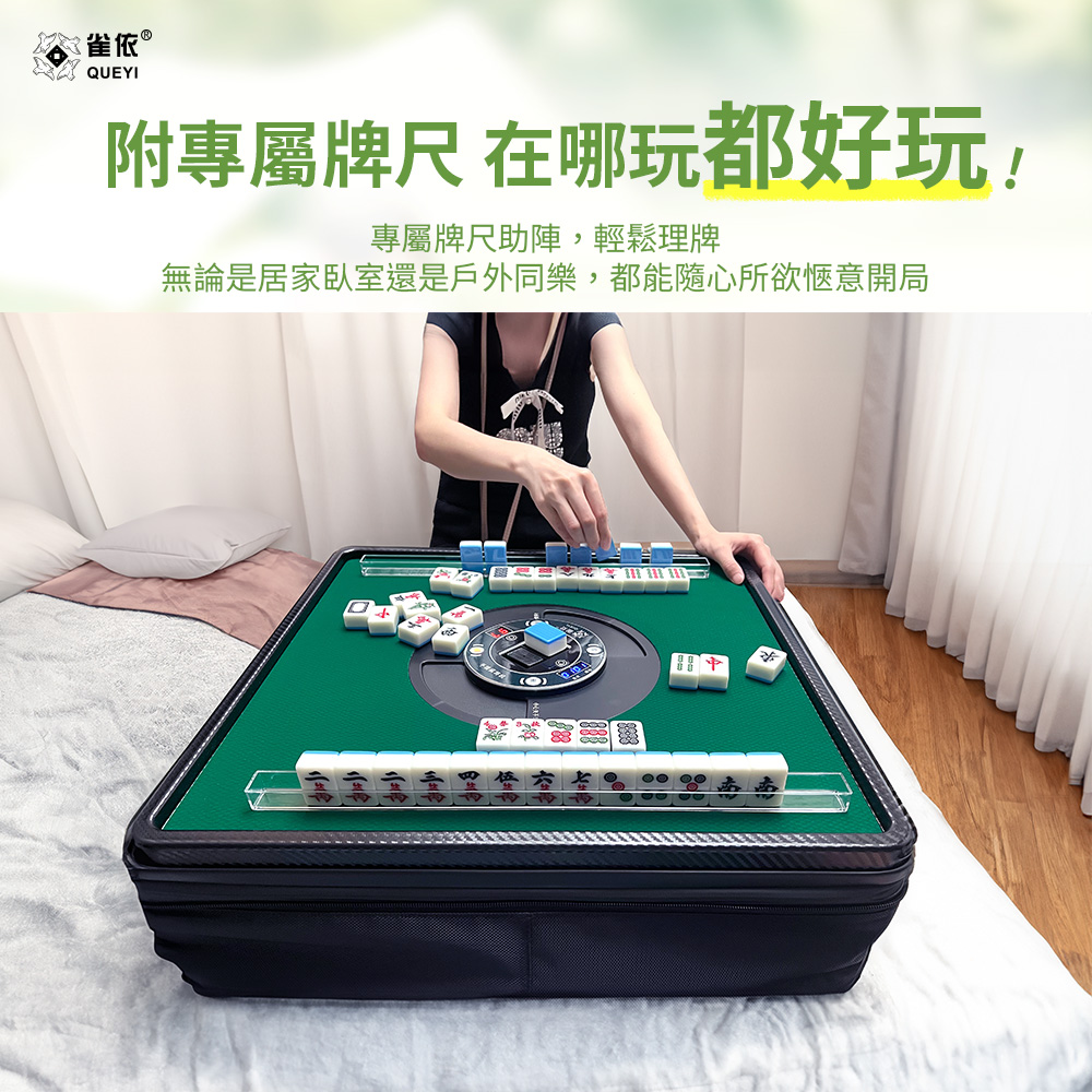 你是不是也愛跟三五好友圍桌打麻將,聽著牌聲嘩啦嘩啦響,享受喊著「碰!」「槓!」的那種爽感?但每次要搬麻將桌、整理牌,總覺得麻煩到想放棄?別擔心,QUEYI 雀依 Q301 手提麻將機來救場啦!這台輕巧又超實用的麻將機,絕對是你最值得入手的娛樂神器!產品特點● 麻將機本體重量僅約6.5Kg,含牌總重約11 Kg,體積小巧(約53×53×14cm),可輕鬆放入汽車後車廂或收進家中角落。想去阿里山露營打牌?還是到朋友家開戰?隨手一提就走,麻將派對想開就開!● 沒插座也能照樣玩!支援行動電源與插座供電,超低耗能,使用20000mAh的行動電源,約可暢玩10Hr。不論是海邊的露營對局,還是室內的深夜狂歡,讓您不受場地限制,實現麻將自由!● 全自動洗牌與發牌系統,秒速開局,有效防止作弊,告別手動洗牌的麻煩。幾秒內即可進入戰鬥狀態,專注享受每一場對戰的刺激!● 採用碳纖維材質,耐用易清潔,質感高雅。內部收納空間可容納麻將、牌尺與行動電源。● 貼心設計,購買即附144張麻將跟4隻牌尺、麻將收納袋、麻將機防塵套,所有配件一應俱全,方便又專業!● 專為熱愛麻將的您而設計,這不只是麻將機,還是你和朋友的回憶製造機~無論是週末聚會、露營旅行,還是戶外派對,都能輕鬆融入,讓歡樂升級。操作簡單易上手,讓您隨時隨地都能享受麻將帶來的樂趣,滿足牌癮。● 送禮的絕佳選擇,既實用新潮又時尚,送給親友保證面子十足。讓每一次相聚都充滿笑聲,變成最珍貴的時光!注意事項※搭配使用的行動電源需具備快充功能,且單口輸出大於12V/2.5A/30W以上,方能達到最佳供電效果。 ※本商品出貨不含行動電源,如有需要,歡迎至佳美能官網選購。※購買所附的麻將為36號磁吸麻將,背面共有藍色和綠色兩種款式,隨機出貨。