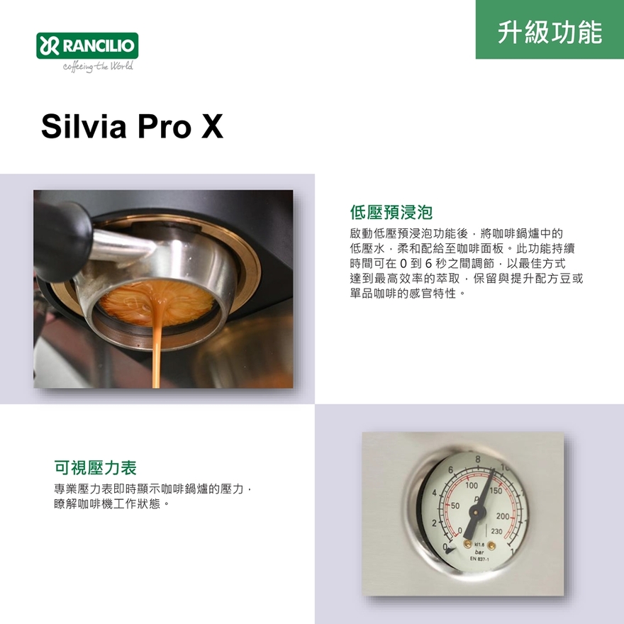 Rancilio Silvia Pro X 結合了經典家用機的耐用性與商業級功能,無論是 義式濃縮、拿鐵 或其他咖啡飲品,都能提供專業級體驗,是進階咖啡玩家值得投資的一款高端義式咖啡機。【主要特色】☕ 雙鍋爐設計 (Dual Boiler)0.3L 咖啡鍋爐 (黃銅材質) 負責萃取,提供穩定水溫1L 蒸氣鍋爐 (不鏽鋼材質) 獨立運作,可同時進行蒸氣發泡🌡 PID 精準溫控電子 PID 溫控系統,調整萃取溫度透過數位顯示器監控鍋爐溫度,確保穩定萃取🕘 可調式預浸泡 (Soft Pre-Infusion)提供軟性預浸泡,讓咖啡粉在萃取前先吸收熱水,提升均勻萃取效果💨 強大蒸氣動力1L 獨立蒸氣鍋爐,穩定提供強勁蒸氣專業級不鏽鋼蒸氣棒 (可 360° 旋轉) 打造細膩奶泡💧 即熱式熱水出口可直接取熱水,用於美式咖啡、茶或其他飲品📏 水箱與排水功能2L 可拆式水箱,方便補水與清潔可拆卸滴水盤,簡化維護與清潔流程