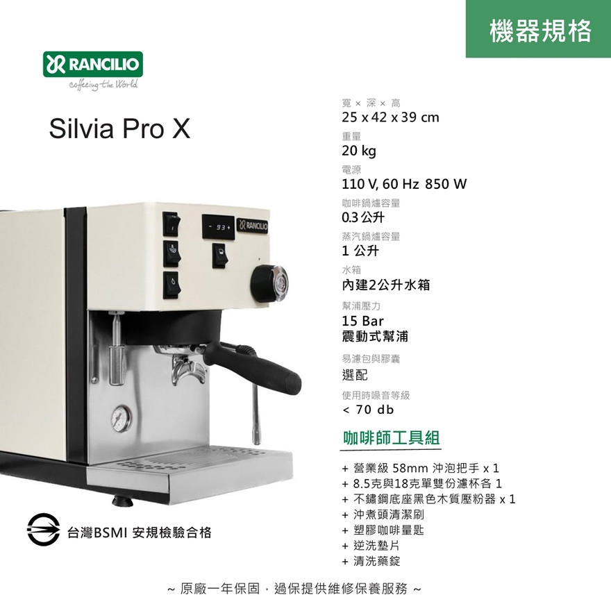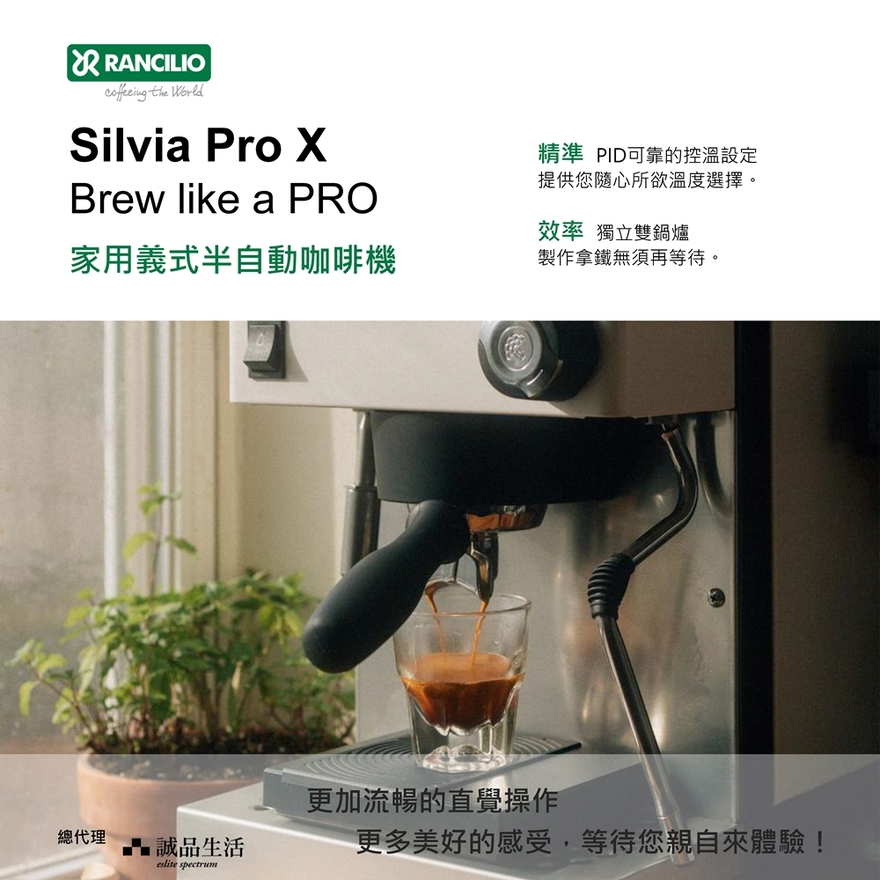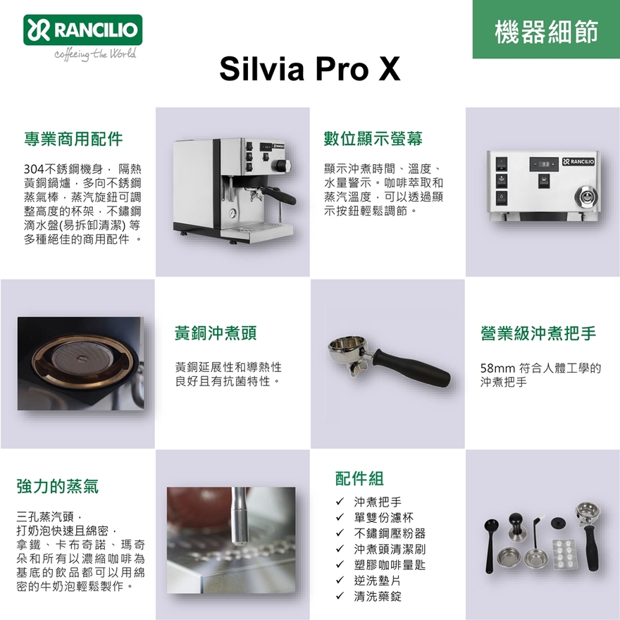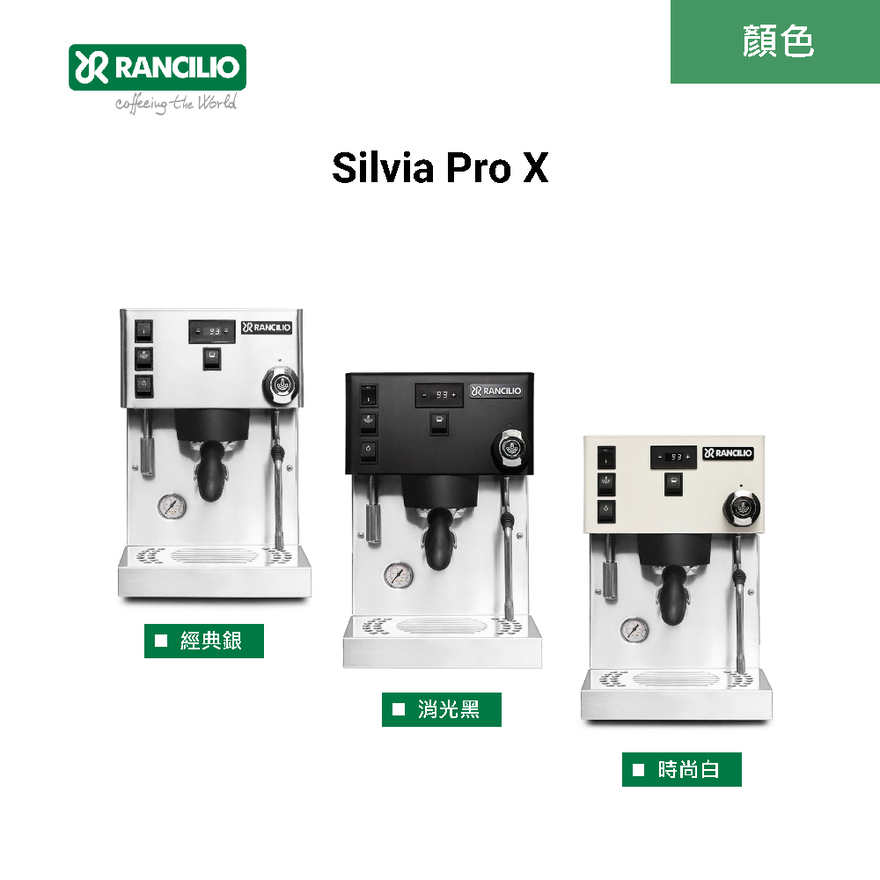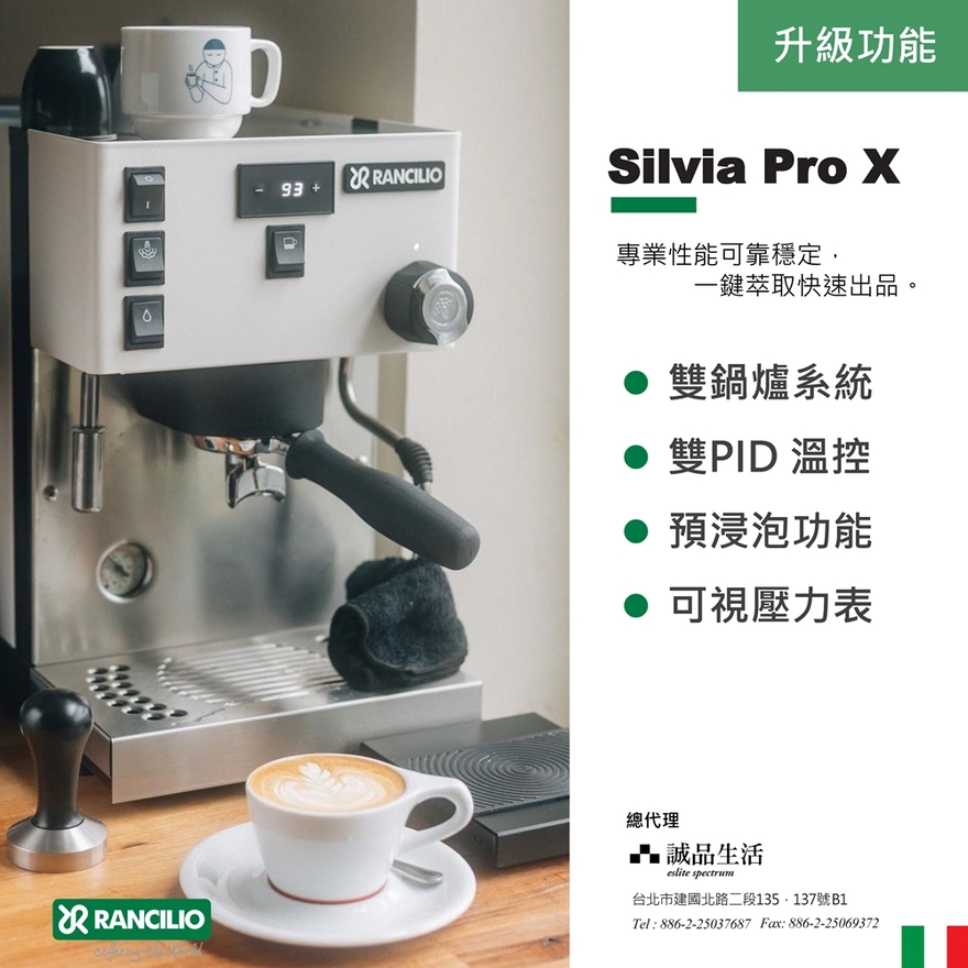 Rancilio Silvia Pro X 結合了經典家用機的耐用性與商業級功能,無論是 義式濃縮、拿鐵 或其他咖啡飲品,都能提供專業級體驗,是進階咖啡玩家值得投資的一款高端義式咖啡機。【主要特色】☕ 雙鍋爐設計 (Dual Boiler)0.3L 咖啡鍋爐 (黃銅材質) 負責萃取,提供穩定水溫1L 蒸氣鍋爐 (不鏽鋼材質) 獨立運作,可同時進行蒸氣發泡🌡 PID 精準溫控電子 PID 溫控系統,調整萃取溫度透過數位顯示器監控鍋爐溫度,確保穩定萃取🕘 可調式預浸泡 (Soft Pre-Infusion)提供軟性預浸泡,讓咖啡粉在萃取前先吸收熱水,提升均勻萃取效果💨 強大蒸氣動力1L 獨立蒸氣鍋爐,穩定提供強勁蒸氣專業級不鏽鋼蒸氣棒 (可 360° 旋轉) 打造細膩奶泡💧 即熱式熱水出口可直接取熱水,用於美式咖啡、茶或其他飲品📏 水箱與排水功能2L 可拆式水箱,方便補水與清潔可拆卸滴水盤,簡化維護與清潔流程