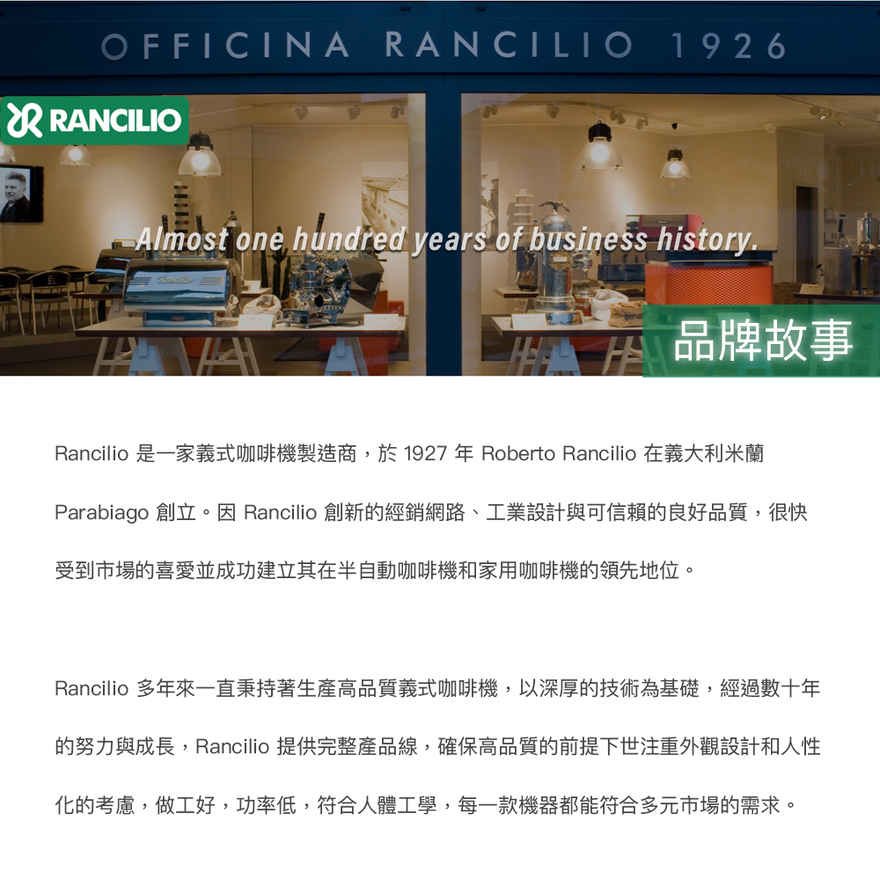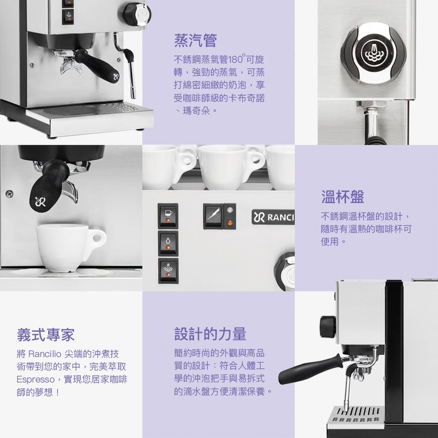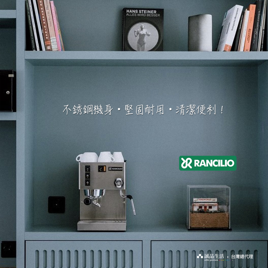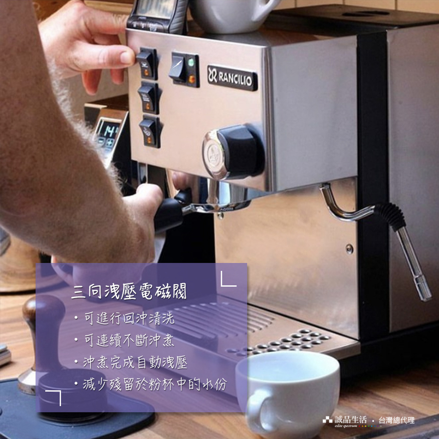 •黃銅沖煮頭與58mm營業級沖泡把手•額定電壓:120V•額定消耗功率:1000W•咖啡鍋爐容量:0.3 公升•水箱:內建2公升水箱•使用時噪音等級:< 70 db•幫浦壓力:15 Bar•產地:西班牙 (Rancilio Italy 西班牙廠生產)•台灣代理商 : 誠品生活股份有限公司