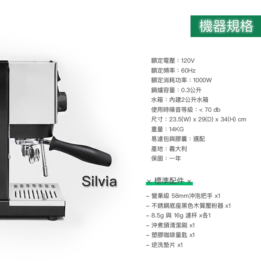 陪伴台灣咖啡市場一起成長的家用機款 Silvia歐洲最熱門的家用機 Silvia 大家心目中 Espresso的意識啟蒙機 Silvia專業咖啡師熱衷於改造的義式咖啡機 Silvia深受歡迎和廣受認可的義大利品牌 Rancilio藍奇里奧 ,於1997年推出 Silvia 至今,經過多次優化與更新,不僅提升性能同時也增強了可靠性。Silvia 以 簡潔經典 的設計風格聞名,外觀上沒有過多花俏的裝飾,給人一種 堅固耐用且專業 的感覺。這些獨有的特徵,讓人能輕鬆地辨識 RancilioSilvia咖啡機 ~一款值得信賴的 家用半自動義式咖啡機,咖啡愛好者和專業人士給予高度評價,市場上不敗的義式經典 Silvia,除了 經典銀 還有 時尚白 消光黑讓您實現居家咖啡師的夢想,完美體驗專業的Espresso 樂趣 !【 產品規格 】•品名:【Rancilio】Silvia 單鍋爐單孔 家用半自動義式咖啡機•顏色 : 經典銀、 時尚白 、消光黑•重量:14 kg