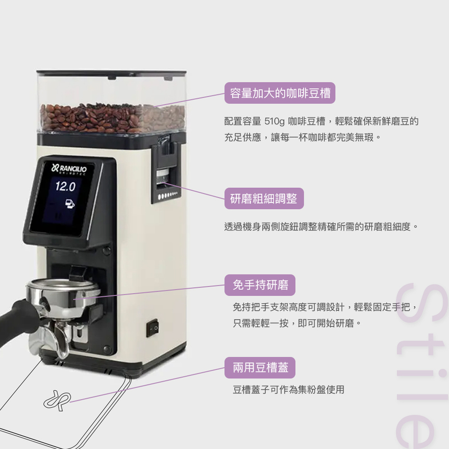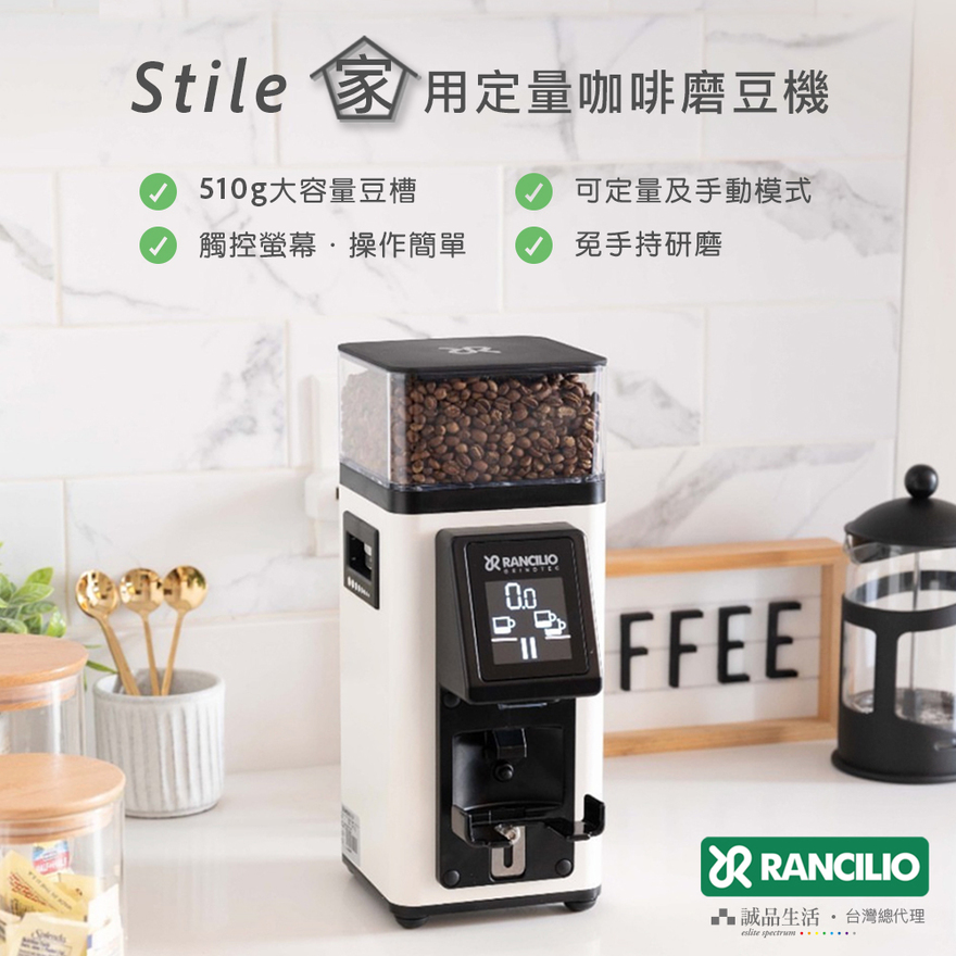 Rancilio Stile 是一款專為咖啡愛好者與營業店家 設計的小巧且功能強大的定量磨豆機,具備精確研磨與易於操作的特性。特別適合對咖啡品質有要求的個人用戶,同時也是咖啡店作為第二台義式磨豆機的理想選擇。無論是家庭用戶追求穩定高品質的研磨,或是咖啡館需要一台高效能的備用義式磨豆機,Stile 都是絕佳選擇!【商品特色】✔ 雙計時電子定量 – 可設定 單杯 / 雙杯 研磨時間,確保穩定粉量輸出。✔ 觸控螢幕.操作簡單✔ 免手持研磨✔ 無極微調研磨 – 精細調整粗細度,適用 義式濃縮、手沖 等不同沖煮方式。✔ 高效能 58mm平刀盤 – 均勻研磨顆粒,提高萃取穩定性。✔ 低殘粉直出粉設計 – 保持研磨新鮮度,減少殘粉堆積。✔ 輕巧時尚設計 – 節省空間,適合家庭、小型商業場域。✔ 靜音運行 – 降低噪音,提供更安靜的咖啡體驗。✔ 510g大容量豆槽✔ 兩用豆槽蓋