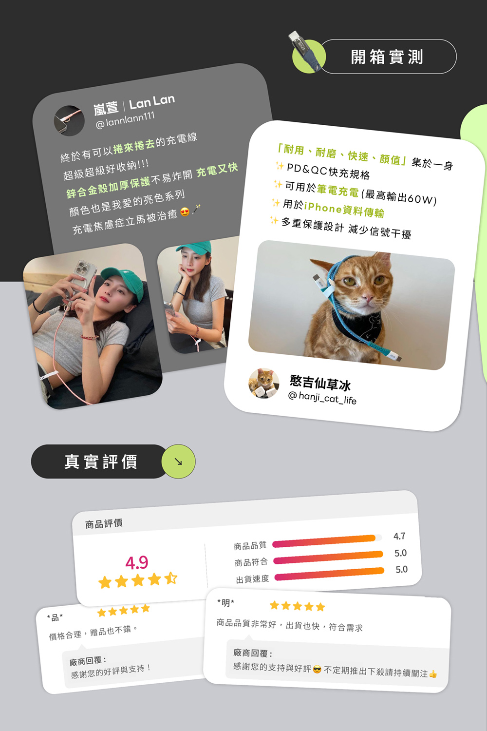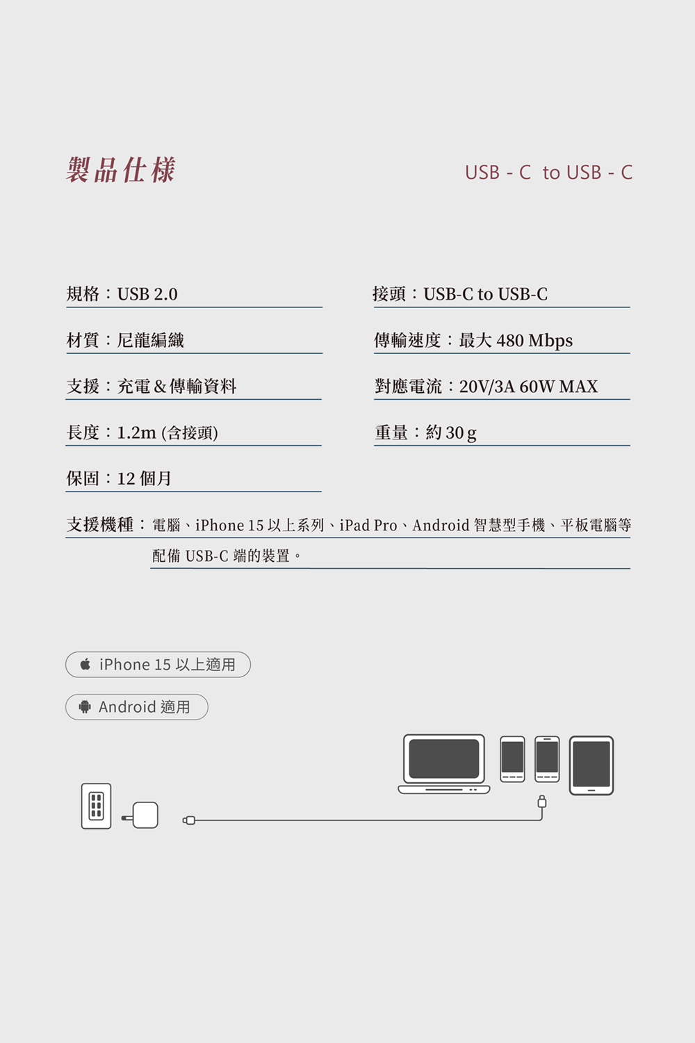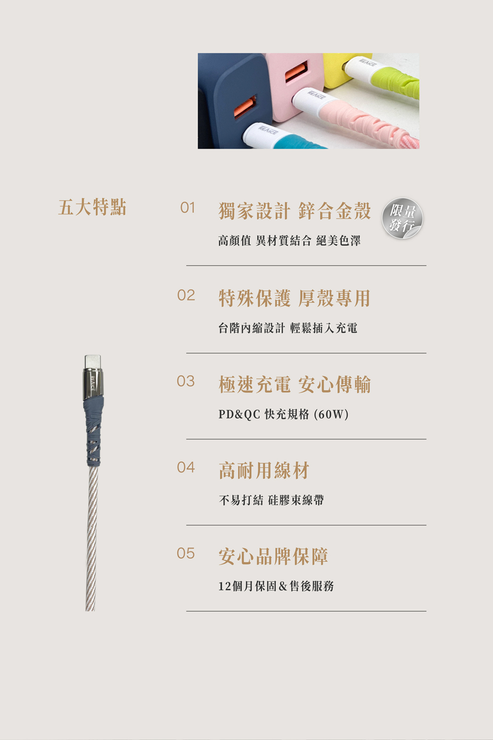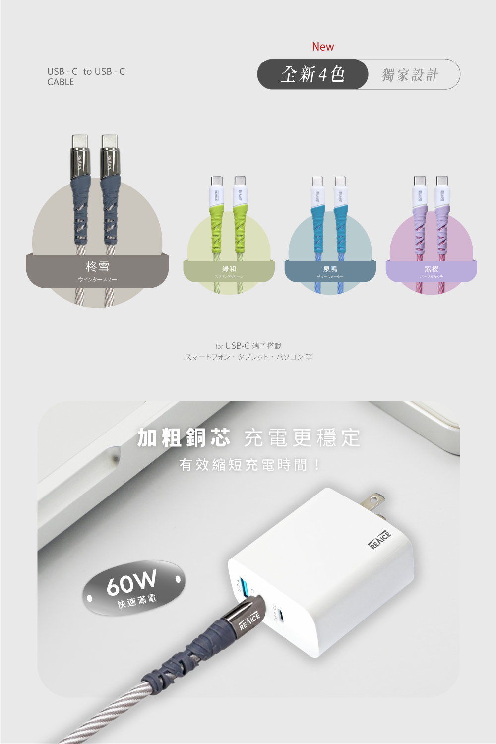 【A+全新福利品】 REAICE Type-C to Type-C 1.2M 耐磨編織充電線 60W快充/傳輸線/多色可選