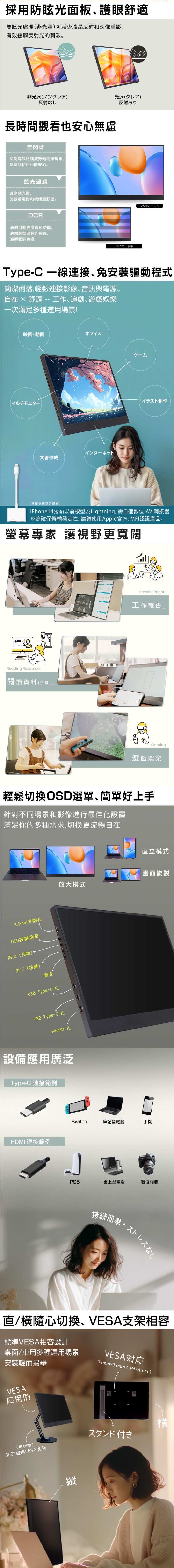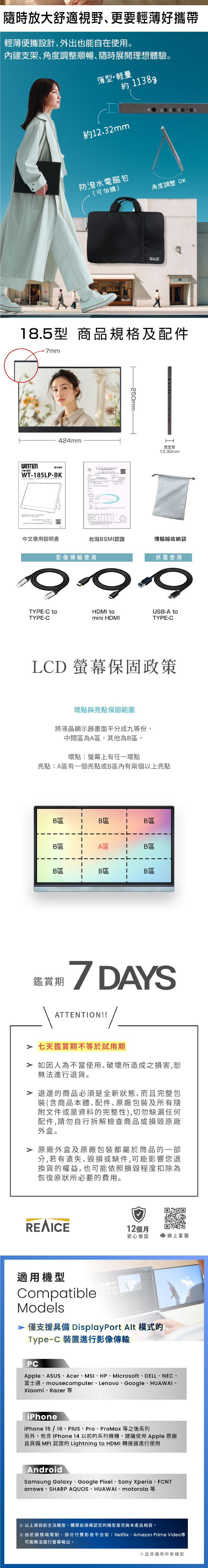 面板類型:TFT IPS(防眩光)螢幕尺寸:18.5 吋解析度:Full HD ( 1920x1080)顯示色彩:1670 萬色亮度:300 cd/m2對比度:1000 : 1畫面比例:16 : 9可視角度:上下左右各178°色域範圍:72%反應時間:14ms更新率:75Hz耗電量:最大20W輸入介面:USB Type-Cx2 (影像輸入/電源)、mini HDMI x1輸出介面:3.5mm 耳機孔 x1☆建喇叭:立體聲 1W x2機身尺寸:約寬度424x高度250x深度12毫米機身重量:約1138克產地:中國1年保固期*Type C 接口的手機或筆電,要透過Type C 投屏螢幕的話手機或筆電本身要有支援"影像輸出(DisplayPort)",若需此功能的用戶請先確認手機或筆電是否支援。*注意:電腦或手機需能支援 USB-Type C(USB 3.1 映像入力・給電用),請務必確認