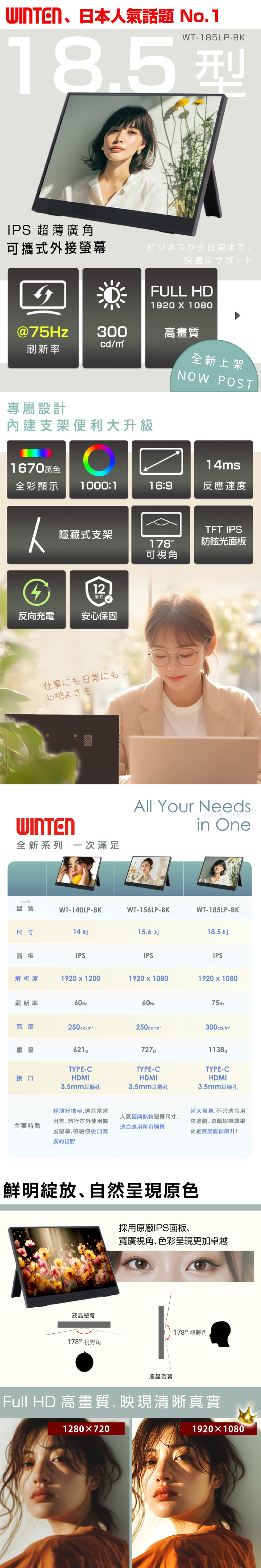 贈螢幕清潔三件組【台陞科技】REAICE 日本Winten 18.5吋IPS超薄可攜式L型外接螢幕 WT-185LP-BK