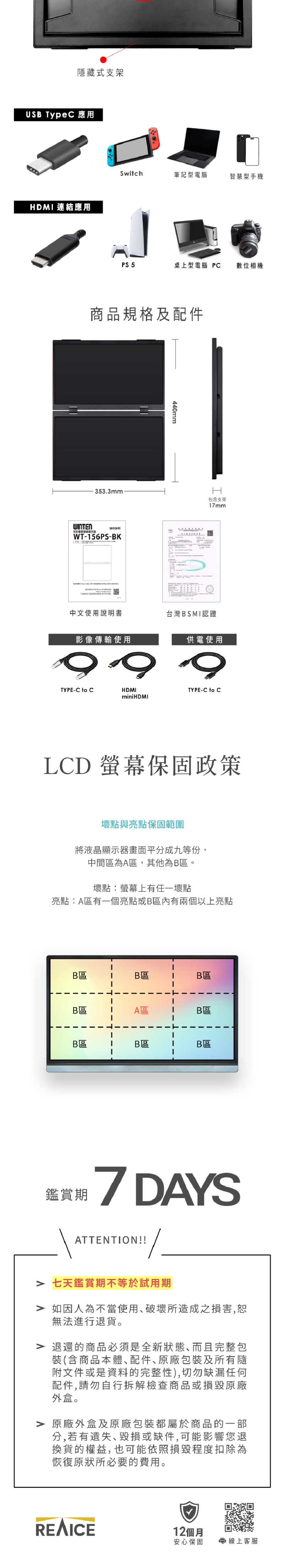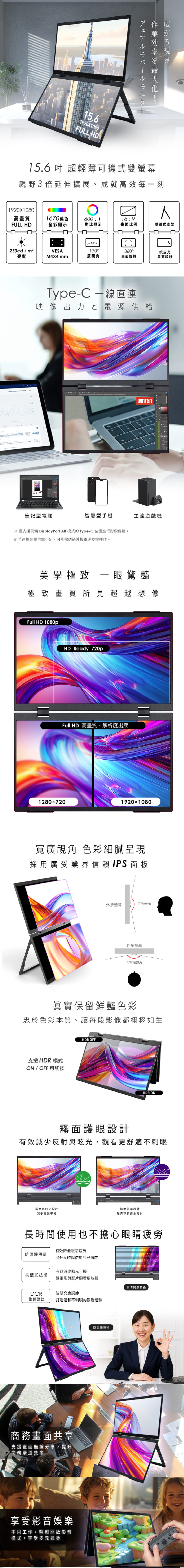 面板類型:TFT IPS(防眩光)螢幕尺寸:15.6 吋解析度:FHD 1920X1080顯示色彩:1670 萬色亮度:250 cd/m2對比度:800 : 1畫面比例:16 : 9視角:廣視角170°色域範圍:45%反應速度:20毫秒更新率:60Hz耗電量:最大20W輸入端:USB Type-C(用於影像輸入/電源)x3 mini HDMIx2輸出端子:耳機插孔3.5mmx2內建喇叭:立體音1WX2機身尺寸:寬353.3X高220X深27毫米重量:約1.85公斤產地:中國1年保固期商檢字號:R3F103*Type C 接口的手機或筆電,要透過Type C 投屏螢幕的話手機或筆電本身要有支援"影像輸出(DisplayPort)",若需此功能的用戶請先確認手機或筆電是否支援。*注意:電腦或手機需能支援 USB-Type C(USB 3.1 映像入力・給電用),請務必確認