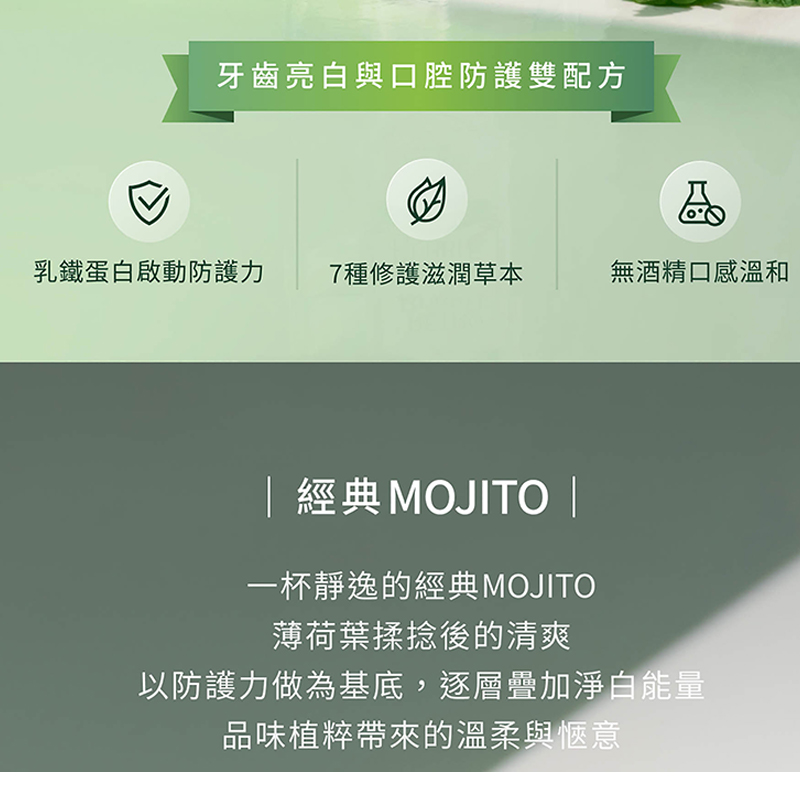 「乳鐵亮白草本漱口水-MOJITO口味」為您帶來口腔健康與美白體驗。融合清新薄荷和Mojito風味,專注亮白和口腔防護,含乳鐵蛋白、木醣醇,植酸和虎杖根,清潔明亮牙齒。積雪草和光果甘草提供潤澤修護,植物精華預防牙周病。無氟化物和酒精,解決下巴痘痘粉刺問題。感受溫柔舒適口腔護理,展現自信笑容!
