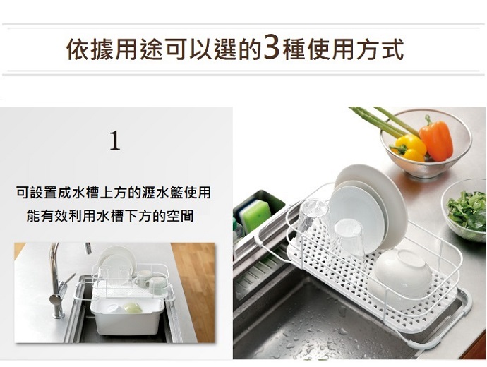 可依照各式用途選擇不同變化使用當瀝水籃使用時,能輕鬆整理收納廚房周圍空間亦可當料理輔助平台使用,能確保料理空間設有卡榫,外層框架能拆下清洗本體尺寸:約18.6×11.4×47cm材質:本體/鋼(粉體烤漆+清漆)・瀝水盤/PP 防滑物/熱可塑性彈性合成橡膠原産国:越南※瀝水盤上方最多承受約3KG※適用於長約36-42CM水槽