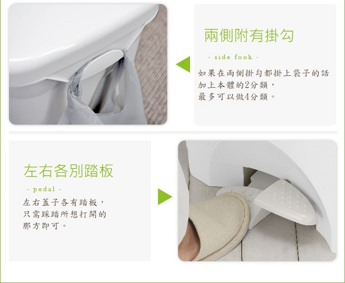 踩踏式設計 即使做菜時也能輕鬆使用左右各有踏板 可以需求開啟一方桶內分隔板及兩側附有掛勾 最多可以做到4分類