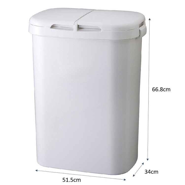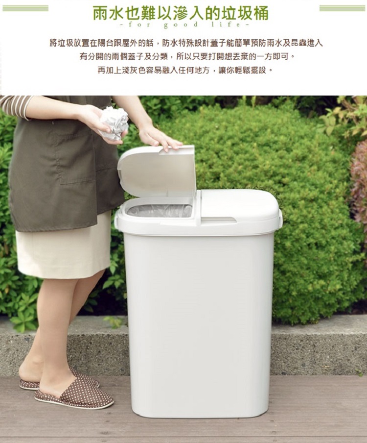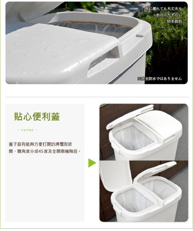 特殊防水設計的蓋子,雨水也不易進入蓋子打開及關閉角度各有45及全開模式兩種階段貼心的分類隔板及分開蓋子,讓你只需要打開想投入的一方即可蓋子與本體也附有扣鎖,牢固不易脫落內部附有垃圾袋扣環,垃圾袋不外露【商品規格】尺寸:長34×寬51.5×高66.8(cm)顏色 : 淺灰色材質: PP容量: 74L產地: 日本重量: 3.561kg