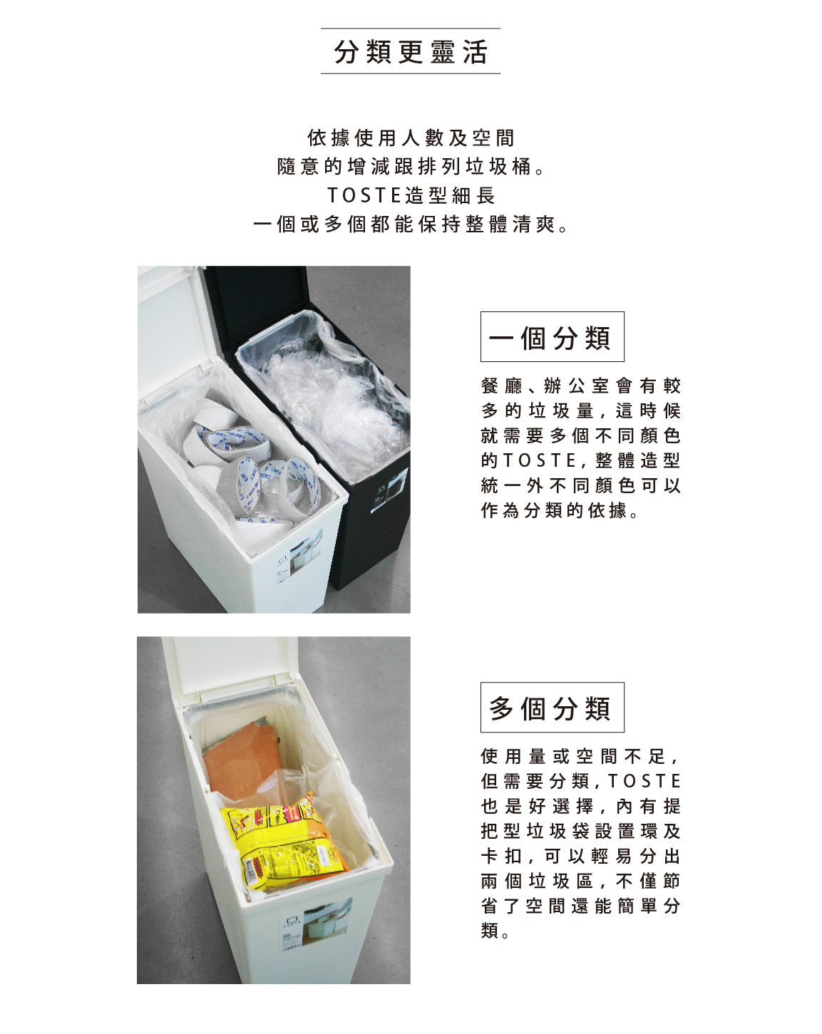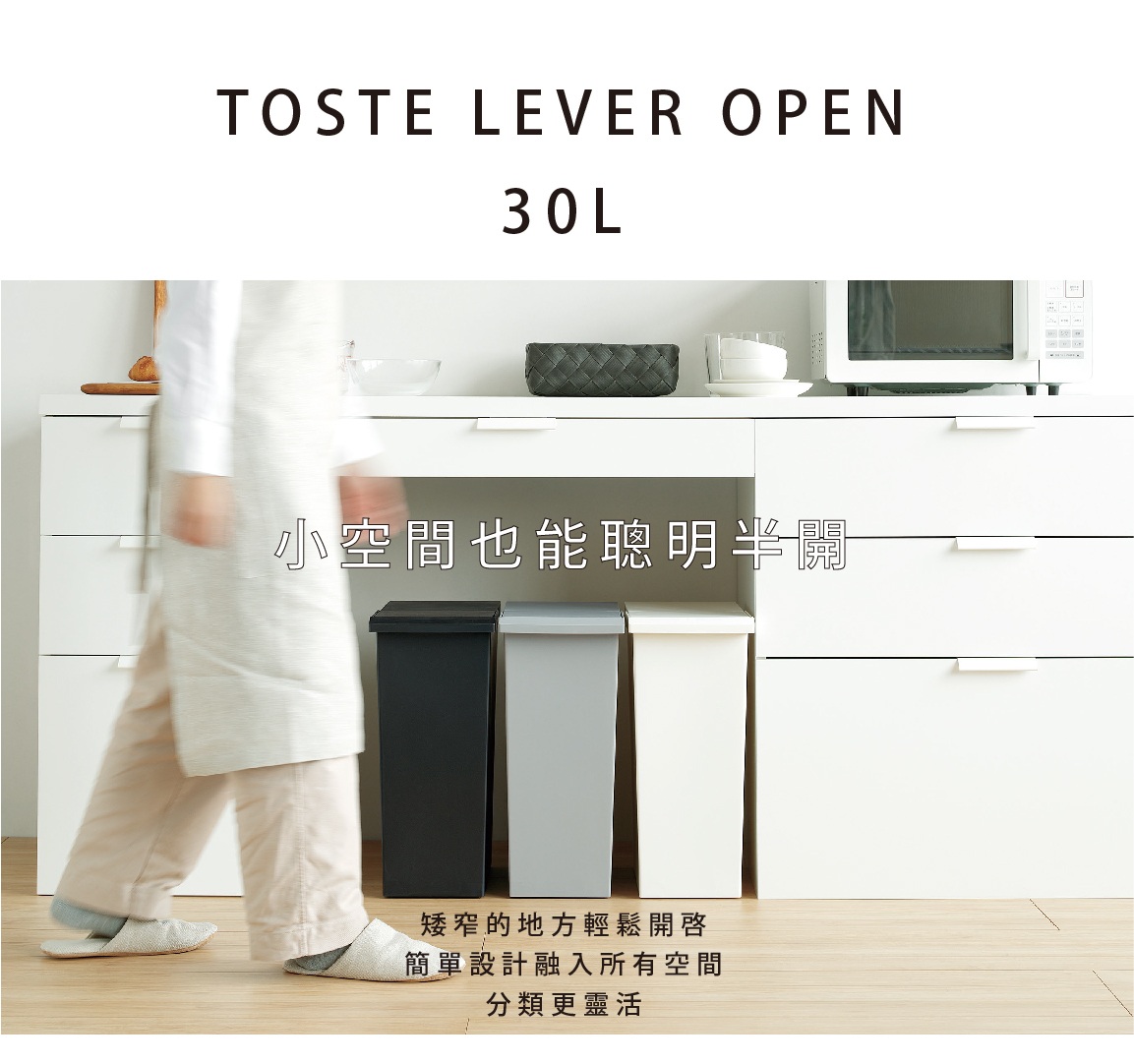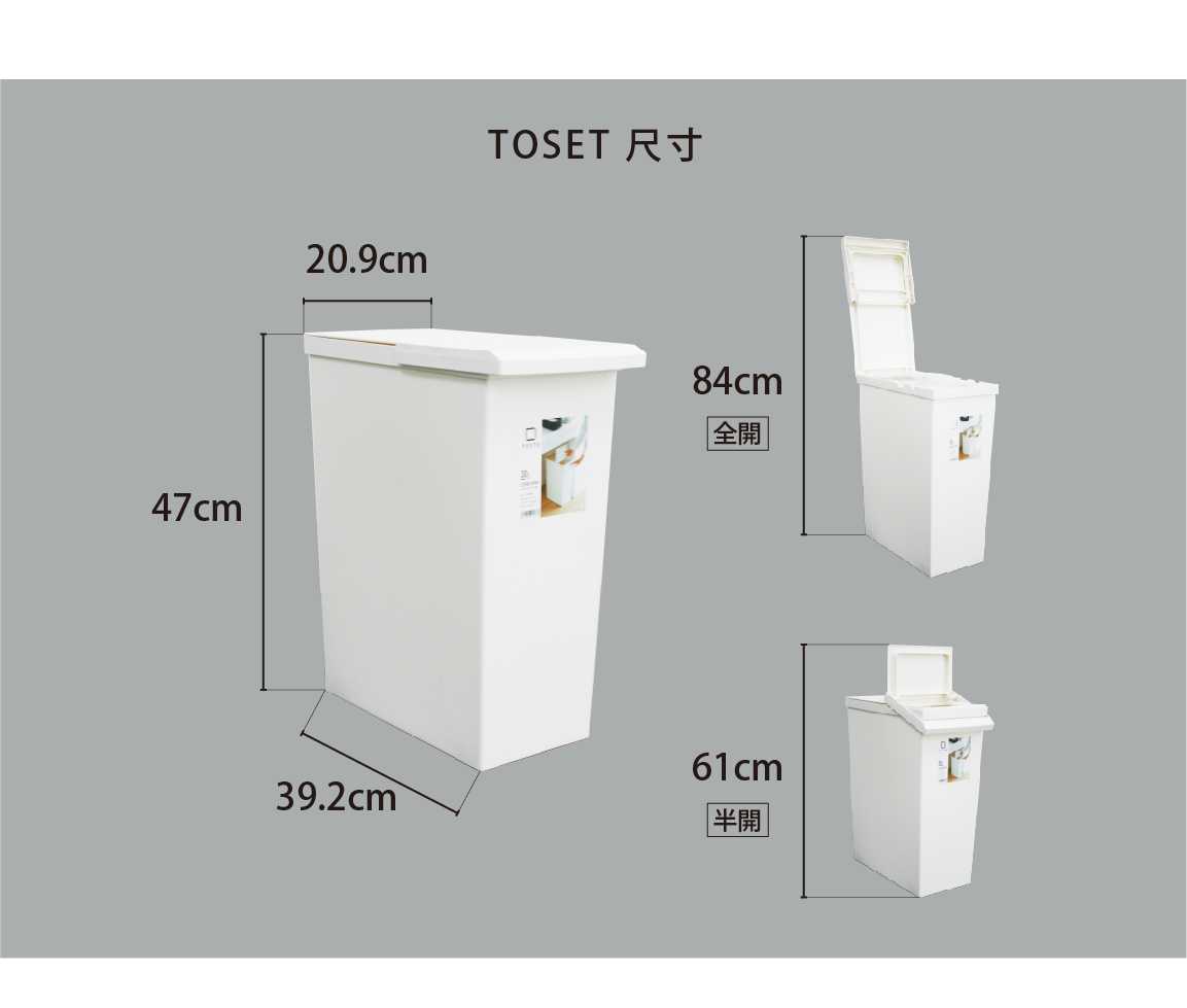 小空間也能聰明半開Toset 垃圾桶 擁有兩種掀蓋新體驗 讓垃圾分類使用更加方便簡單容量:30公升尺寸:20.9x39.2x高47cm (半開高61/全開高84cm)重量:約1.4kg產地:日本材質:聚丙烯注意事項:商品上的接縫處及壓痕為製造過程中自然產生之情況