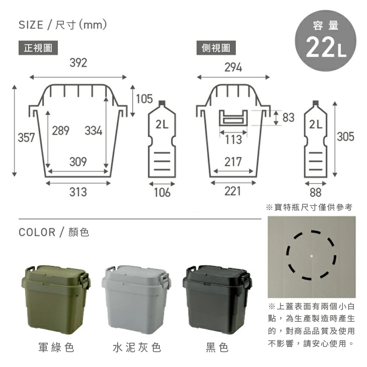 內部特殊的蜂巢式設計 造就出不輕易損壞的收納空間耐重可達100公斤重,可坐可站立,在戶外也可直接當桌子使用黑色、軍綠色、水泥灰色都非常適合於戶外活動外觀尺寸:寬39.2 x 長29.4 x 高37(公分)內部尺寸:寬30.9 x 長21.7 x 高28.9(公分)材質:PP(聚丙烯)製品重量:1386g上部承受重量:約100kg容量:20公升製造國:日本