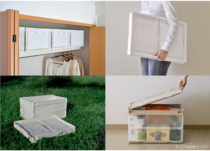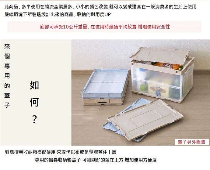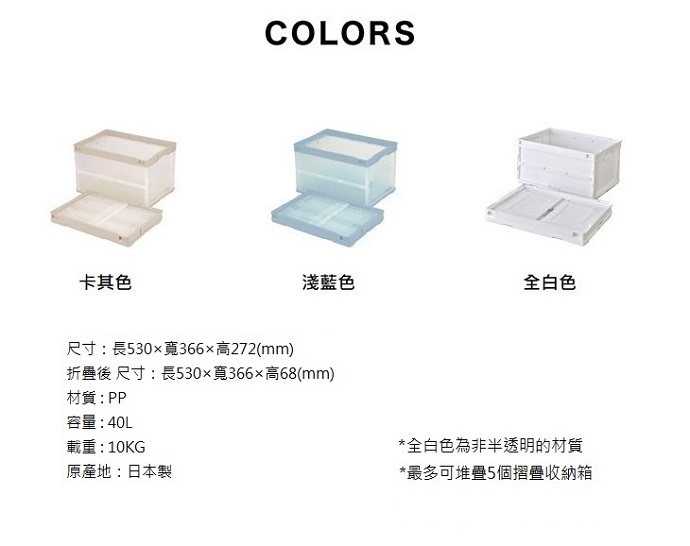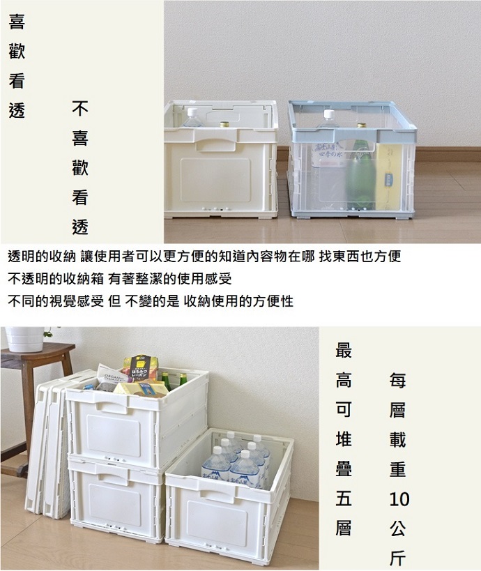 這是一個可以折疊的收納箱,半透明的外觀,您可以很清楚的知道內容物食材收納、雜物收納、車用收納...等,都不是問題當您不需要它時,只要折疊起來折疊後的高度僅有7cm,所以非常不占空間最高還可堆疊至五層,每層的底部載重達10公斤尺寸:長530×寬366×高272(mm)折疊後 尺寸:長530×寬366×高68(mm)材質 : PP 容量 : 40L載重 : 10KG原產地:日本製*全白色為非半透明材質*此商品蓋子需另外加購