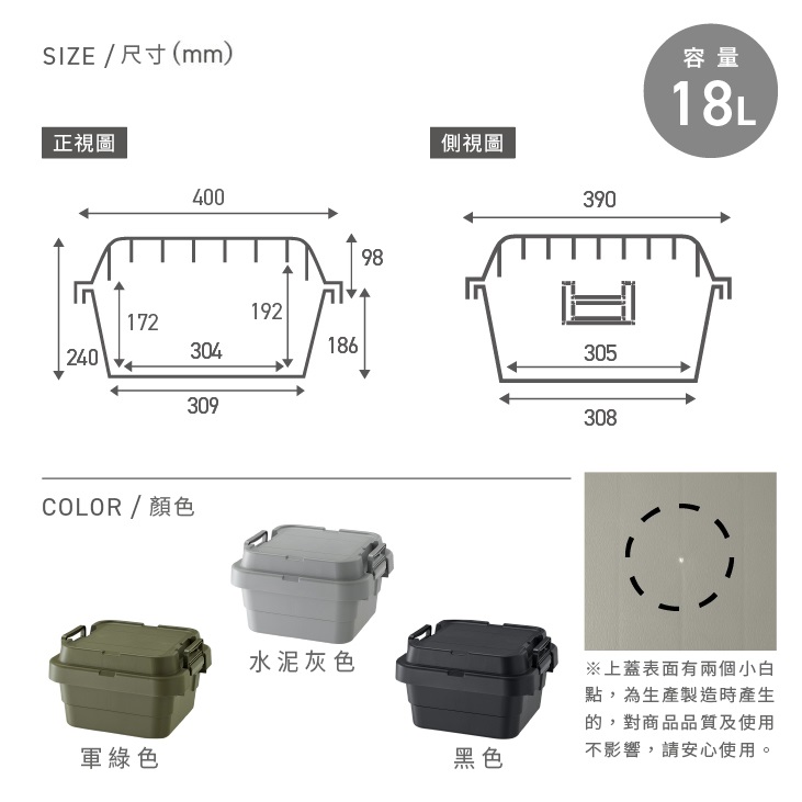 廣受好評的耐重收納箱 除了標準版的70L、50L、30L、20L針對不同需求,本次隆重推出30S-LOW容量為18L,但他是30L的矮款,可堆疊30L耐重一樣可達100公斤重,可坐可站立,非常適合收納快速拿取的物品同樣也有黑色、軍綠色、水泥灰色更多容量、更多選擇,讓您愛怎麼裝就怎麼裝,隨意搭配外觀尺寸:寬40 x 長39 x 高24(公分)內部尺寸:寬30.9 x 長30.5 x 高19.2(公分)材質:PP(聚丙烯)製品重量:1593g上部承受重量:約100kg容量:18公升 製造國:日本