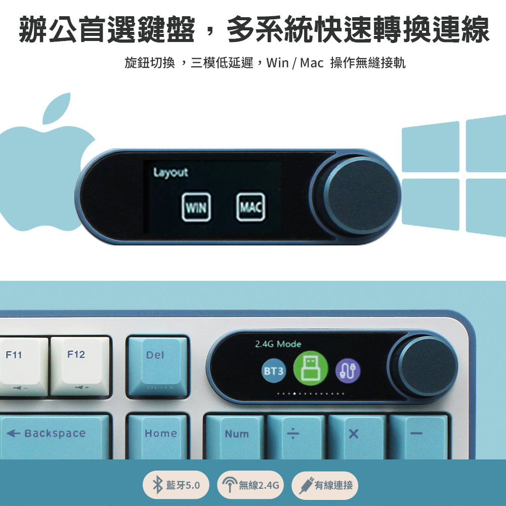 鍵盤支援藍牙、2.4G無線、TYPE-C有線連接,共3種連接方式,還可設定3台藍牙設備快速切換。支援自由切換Windows / Mac 雙系統,滿足各種的工作與跨平台操作需求。無論是出門攜帶,在家遊戲使用,低延遲2.4G、全鍵無衝突功能,滿足多樣化使用場景