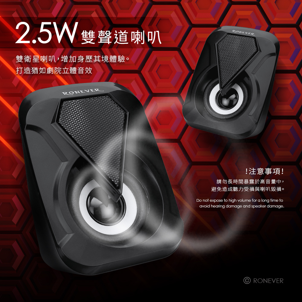 • 兩用設計,可連接藍牙或插入音訊,適用多種設備。• 豪華三件組,電競風格外型搭配炫彩呼吸燈,增加桌面氛圍感。• 採用3吋3W喇叭、2吋2.5W衛星喇叭,低音震膜沉穩厚重效果強勁,音質清晰立體。• AUX有線連接,訊號傳輸不失真;藍牙5.3晶片,傳輸穩定低延遲,最佳的聽覺享受。藍牙技術︰Bluetooth Ver5.3額定電壓︰DC 5V 輸出功率︰3W+2.5Wx2揚聲器︰3吋低音+2吋高音x2信噪比︰≥70dB 頻率響應︰60Hz-16KHz 頻率接收範圍︰≧10M供電介面︰USB連接介面︰藍牙、AUX 主機尺寸︰104x104x155 mm衛星喇叭尺寸︰69x79x105 mm重量︰約601g 線長︰約100cm 材質︰PP塑膠、電子零件包裝內容:藍牙喇叭x1、說明書x1