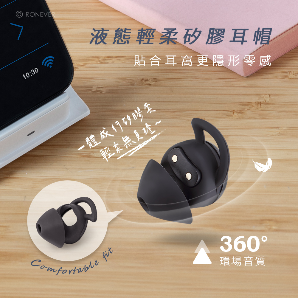• 最新5.3藍牙晶片,低延遲360°環場聽音辨位更精準。• 結合ENC降噪/物理隔噪,更沉浸的聆聽環境。• 石墨烯振膜讓音質更清晰細節更豐富,音場與沉浸感更勝一籌。• 用來聽助眠的白噪音,尤其雨滴或流水聲音相對乾淨又輕柔。• 極致超輕量化設計,空氣感配戴,睡眠側躺無壓迫感。• 液態輕柔矽膠耳帽,耳勾貼合耳窩更隱形零感。• 耳機及充電倉皆有指示燈設計,狀態清楚明瞭。藍牙版本︰藍牙5.3通話處理技術︰CVC6.0 / ENC電池容量︰25mAh充電時間︰約2小時通話時間︰5小時~15小時(音量大小有所差異)接收範圍︰10M(空曠環境)麥克風靈敏度︰-35dB±2喇叭靈敏度︰109dB±2頻響範圍︰2402Mhz-2480Mhz耳機重量︰2g±1(單耳)耳機尺寸︰14x18x16mm額定電壓︰DC 5V / 0.5A充電介面︰TYPE-C充電盒容量︰200mAh充電盒充電時間︰約2-3小時充電盒尺寸︰48x45x25mm充電盒重量︰23g±1材質︰ABS+電子零件包裝內容︰藍牙耳機x1組、充電線x1、說明書x1