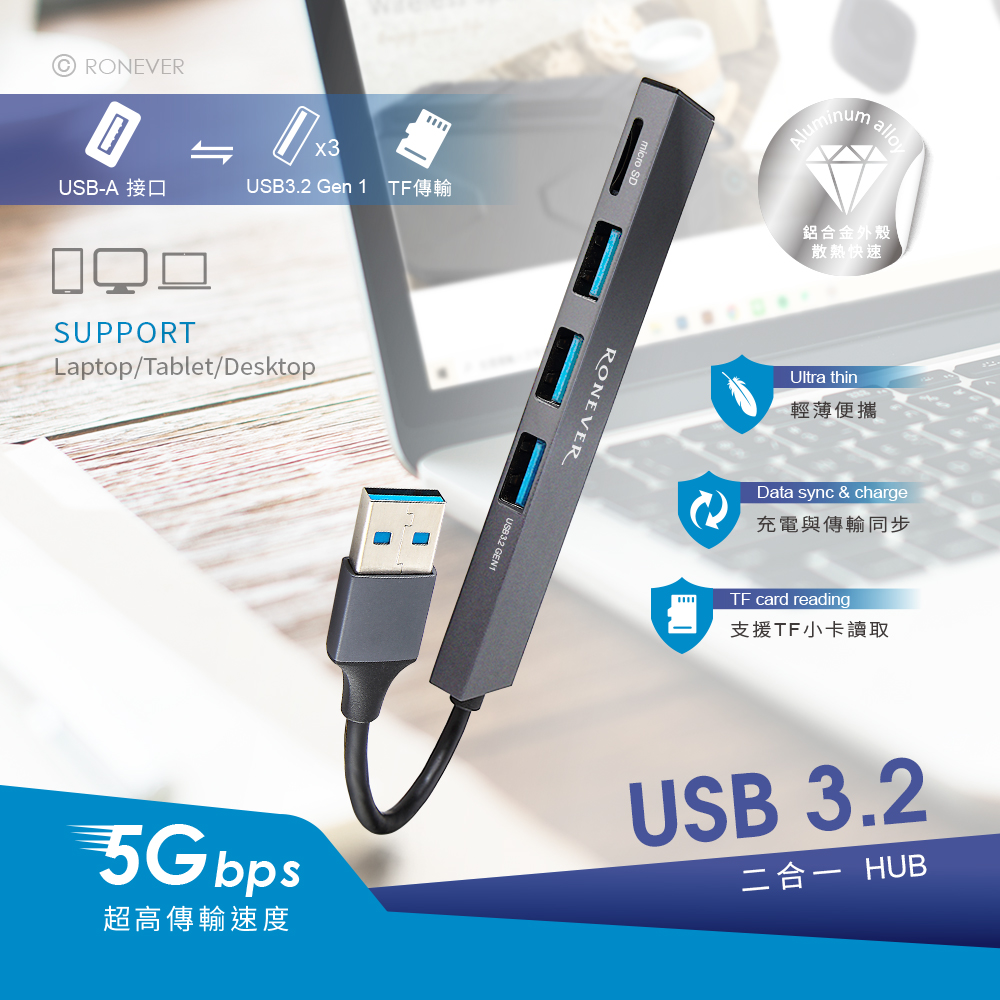 • 輕巧便攜免驅動,支援熱插拔,隨插即用。• 高質感鋁合金外殼,散熱快速,減少電磁波干擾。• 可應用於鍵盤、滑鼠、隨身碟、外接硬碟...等裝置。• 3孔USB3.2 Gen 1擴充埠,具充電及傳輸功能,耗電量低。• USB-A介面接口,支援TF讀卡機(小卡)+3個USB3.2孔,支援多種裝置。額定電壓:DC 5V工作電流:900mAh尺 寸:19x104x7mm線 長:約60mm擴充接口:USB3.2 Gen 1x3 / TF cardx1 (UHS-I)支援系統:MAC OS 10.10以上;Windows 7/8/10/11傳輸速度:USB 3.2 Gen 1支援最高5Gbps傳輸,向下相容 USB2.0重 量:24g材 質:鋁合金、ABS、電子零件轉接介面:USB-A內 容 物:HUBx1
