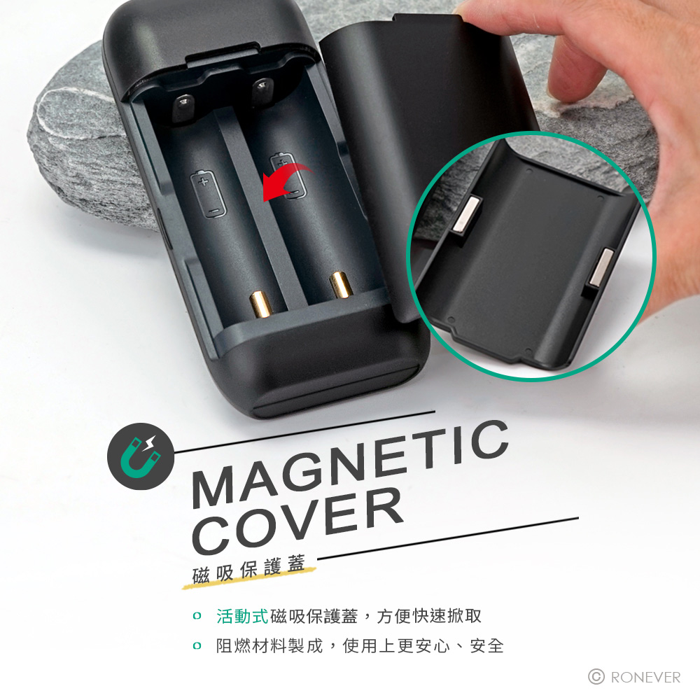 • LED電量/電壓顯示設計,活動式磁吸保護蓋。 • 2節電池平衡充放電技術,延長電池壽命。 • 轉換效率高達90%,兼容大多數手機充電。 • 內含18650增徑固定圈,可預防電池晃動。 • 電流緩衝技術使電池不受強電流沖擊。 • 智能多重保護反接、短路、過充、過熱保護。 • 阻燃材料製成,使用上更安心安全。 輸入電壓:DC 5V/2A、9V/2A 輸出電壓:QC3.0 & PD3.0 (5V/2A、9V/2A、12V/1.5A) 電池充電:4.2V/2Ax1、2Ax2、1Ax2 材 質:ABS+電子零件 產品尺寸:58 x 28 x 126mm 重 量:72g 充電介面:Type-C 充電線長:60cm 包裝內容:充電座x1、說明書x1、布袋x1、USB to Type-C充電線x1、Type-C to Type-C充電線x1 適用長度72mm以內,21700/20700/18700/18650電池