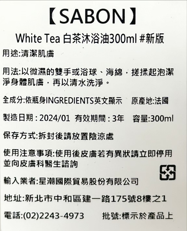 SABON 白茶沐浴油 300ml